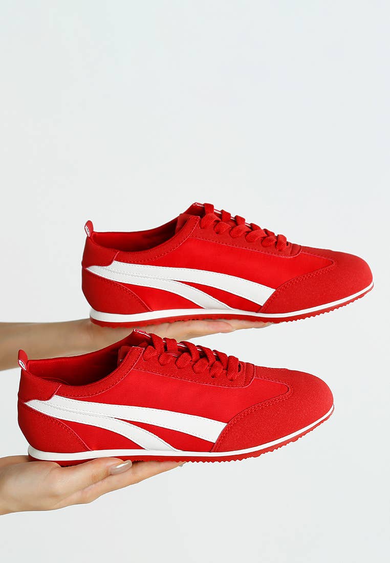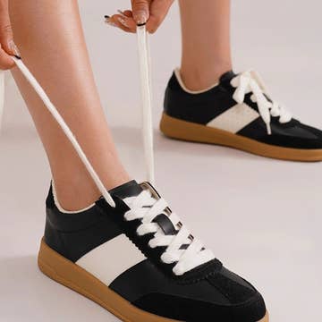 Comfortable and stylish, the sneakers have contrasting paneling details are which give the sneakers an intriguing visual aesthetic. The pull tabs make the sneakers easier to wear while the lace ups give the feet a cozy fit. Type: Sneakers Upper Material: Faux Leather Outer Sole: TPR Flat Heels Closed Round Toe Lace Up Detail Paneling Detail Pull Tabs SH4930