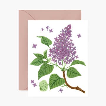 A springtime favorite, the lilac. This light and airy botanical greeting card will bring a smile to any recipient. Perfect for birthdays, a thank you or just a quick note. Size A2 blank folded card, printed on 110lb ultra white, smooth paper. Each card comes with a white envelope. Cards are packaged in a clear protective sleeve.