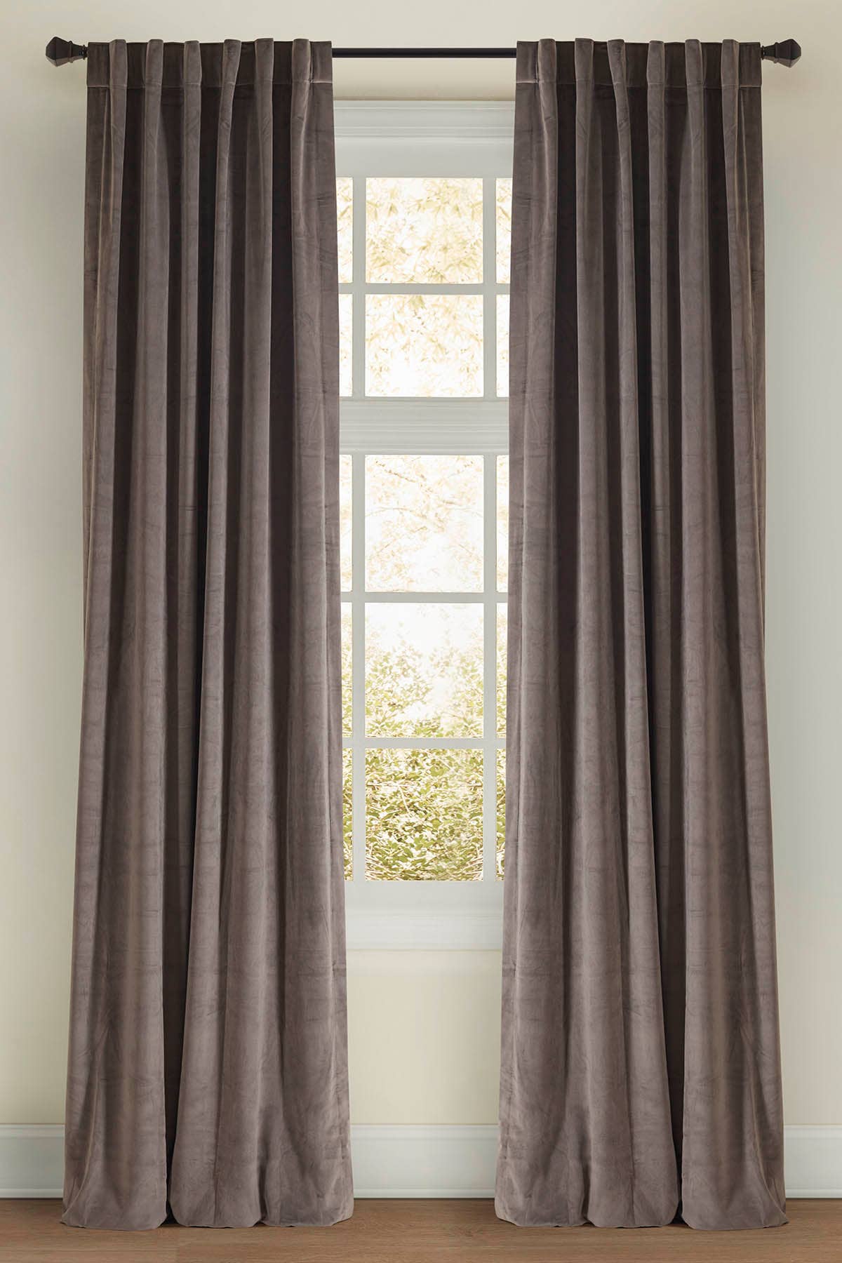 Presenting Stella Plush Cotton Velvet Curtain in a charcoal nuance. Showcasing a subdued take on velvet with a matte texture, this richly dense fabric is perfect for keeping bright light at bay. Woven from cotton velvet, this highly breathable design will make for an urban addition to any space it is welcomed in. • Curtains sold by the panel. • 100% cotton • In stock curtains are washable and ship in 2 days • In stock curtain panels: Rod Pocket with Back Tab, weighted bottom, lined, 2" hems, in 4 sizes: 51" wide x 84", 96", 108" or 120" long. • Machine wash warm with similar colors, do not bleach, do not tumble dry, moderate iron on the reverse of fabric. Dimensions: • 51 inches wide x 84 inches long • 51 inches wide x 96 inches long • 51 inches wide x 108 inches long • 51 inches wide x 120 inches long NOTE: Kindly note, any size not in stock will arrive in 4-6 weeks. Please message us for an estimated delivery date when placing an order.