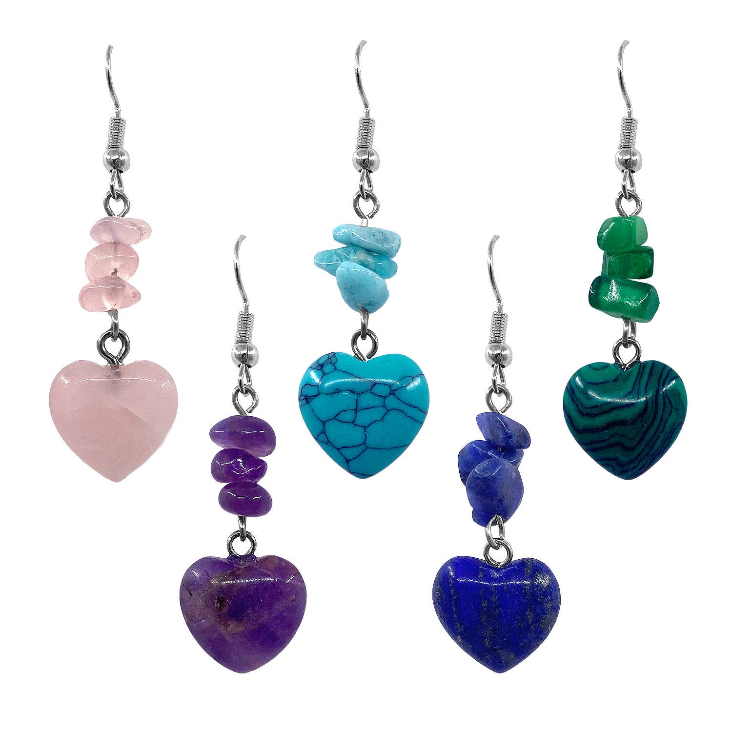 Natural Crystal Sterling Silver (925) Heart Dangling Earring. Stone size 12x12mm. Minimum order 10. You will receive 1 pair each of the following: Tiger Eye, Sodalite, Aventurine, Rose Quartz, Amethyst, Strawberry Quartz, Clear Quartz, Black Onyx, Fluorite, and Labradorite. Condition is New. Free local pickup in Brooklyn, New York. Stones, crystals, crystal jewelry, crystal bulk, spiritual, meditation, metaphysical wholesale.