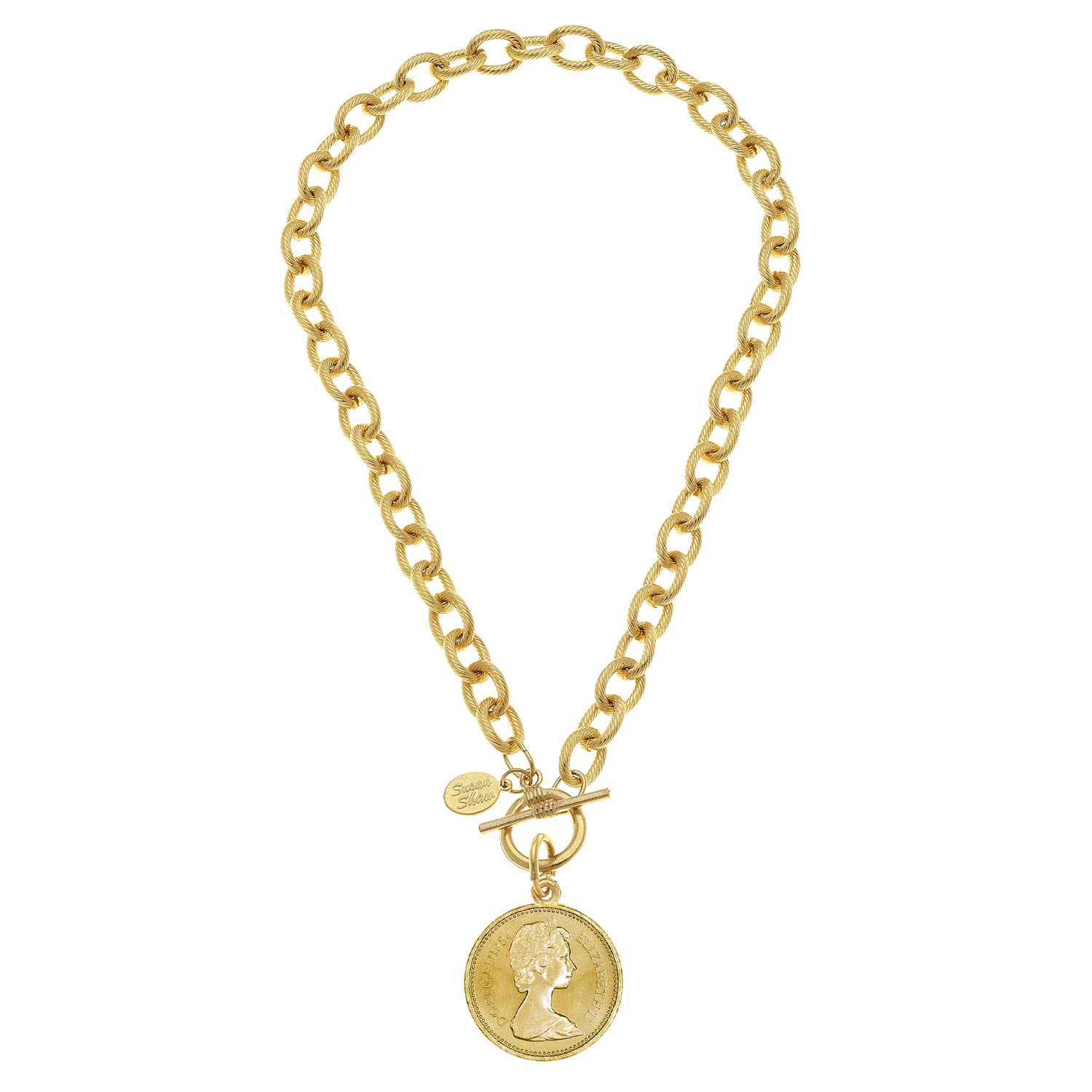 In memory of the great Queen Elizabeth II. Her majesty lived a life of service, putting country and duty before self for 70 years. We recognize her strength, grace, wit, and faith. The legend on this coin reads "Elizabeth II D•G•REG•F•D•1984". The letters stand for the latin words Dei Gratia Regina Fidei Defensor, which translates to "By the Grace of God, Queen and Defender of the Faith". Triple plated 24K gold 16 inches + 3 inch extender chain handmade in San Antonio, TX