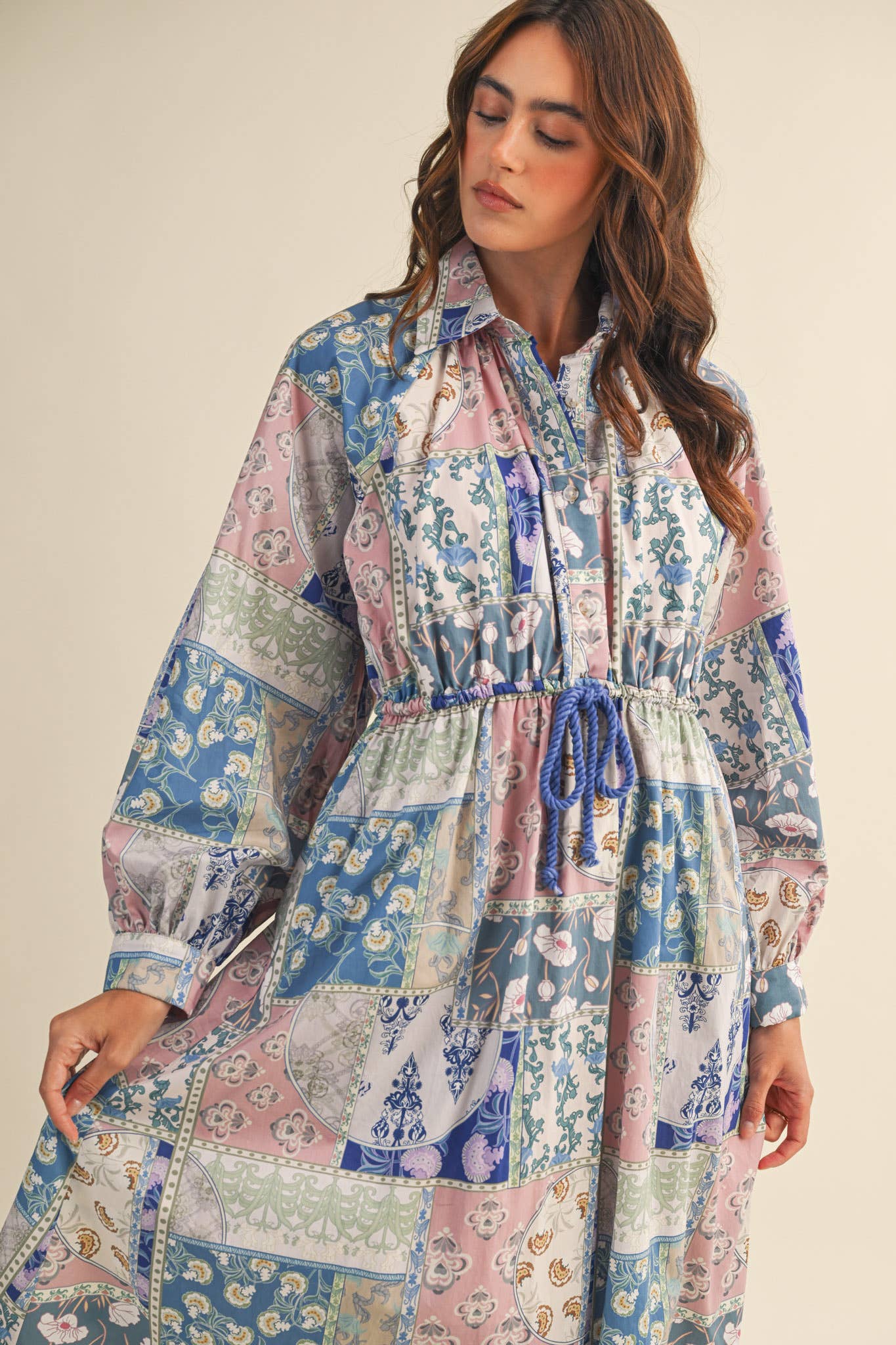 + Mixed stripe belted button down midi dress + Collared neckline with button down placket + Belt loops + Self tying sash + Long puff sleeves with buttoned cuffs + Pockets + Lined + Model is 5' 10.5" 32-24-36 and wears a S