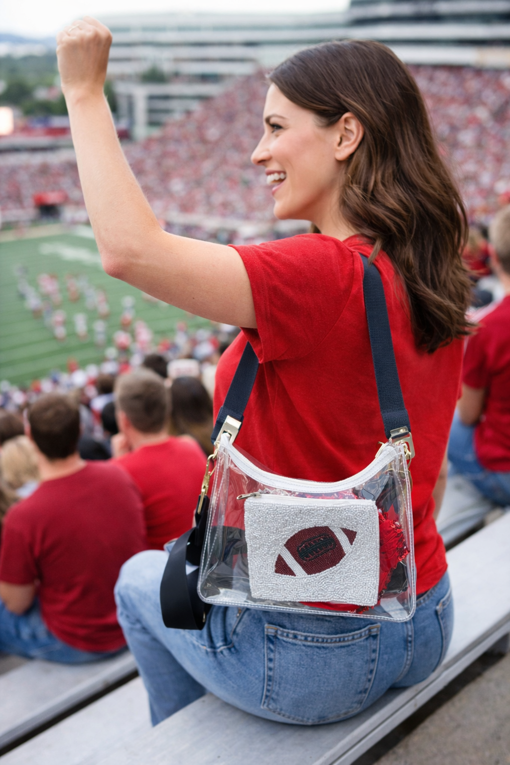 Our removable and adjustable bag strap is the perfect addition to our clear stadium bags. We have multiple color options available that are perfect for game day festivities! Gold Hardware on all straps.