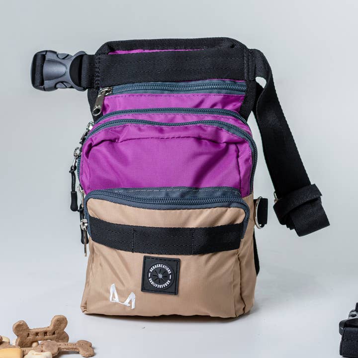 A compact thigh bag with just the right space for your daily dog training essentials. Designed for those who love the convenience of thigh bags but prefer a slimmer profile, the Compact Thigh Treat Bag offers smart functionality without the bulk. 🔹 Smart Storage * Main pocket: Includes a removable insulated sleeve to keep raw or natural treats fresh * Poop bag dispenser: Built-in and discreetly integrated for quick access when needed * Small front compartment: Ideal for personal items like keys, cards, or a clicker * Back pocket: Fits an ice pack to keep treats cool during warm outings 🔹 Slim & Comfortable Fit * Main pocket measures 7 x 5 inches, total height 10 inches * Slim profile sits comfortably on the hip * Includes adjustable waist strap (fits up to 60 inches) * Removable elastic thigh strap (fits up to 30 inches) 🔹 Durable & Functional * Made from high-quality, tough, water-repellent, lightweight canvas * Features external D-rings and MOLLE-style attachments for clip-on gear * Lightweight but practical for minimalist walks or focused training sessions This bag is perfect for trainers, handlers, or active dog owners who want a low-profile, high-performance treat bag that doesn’t get in the way.