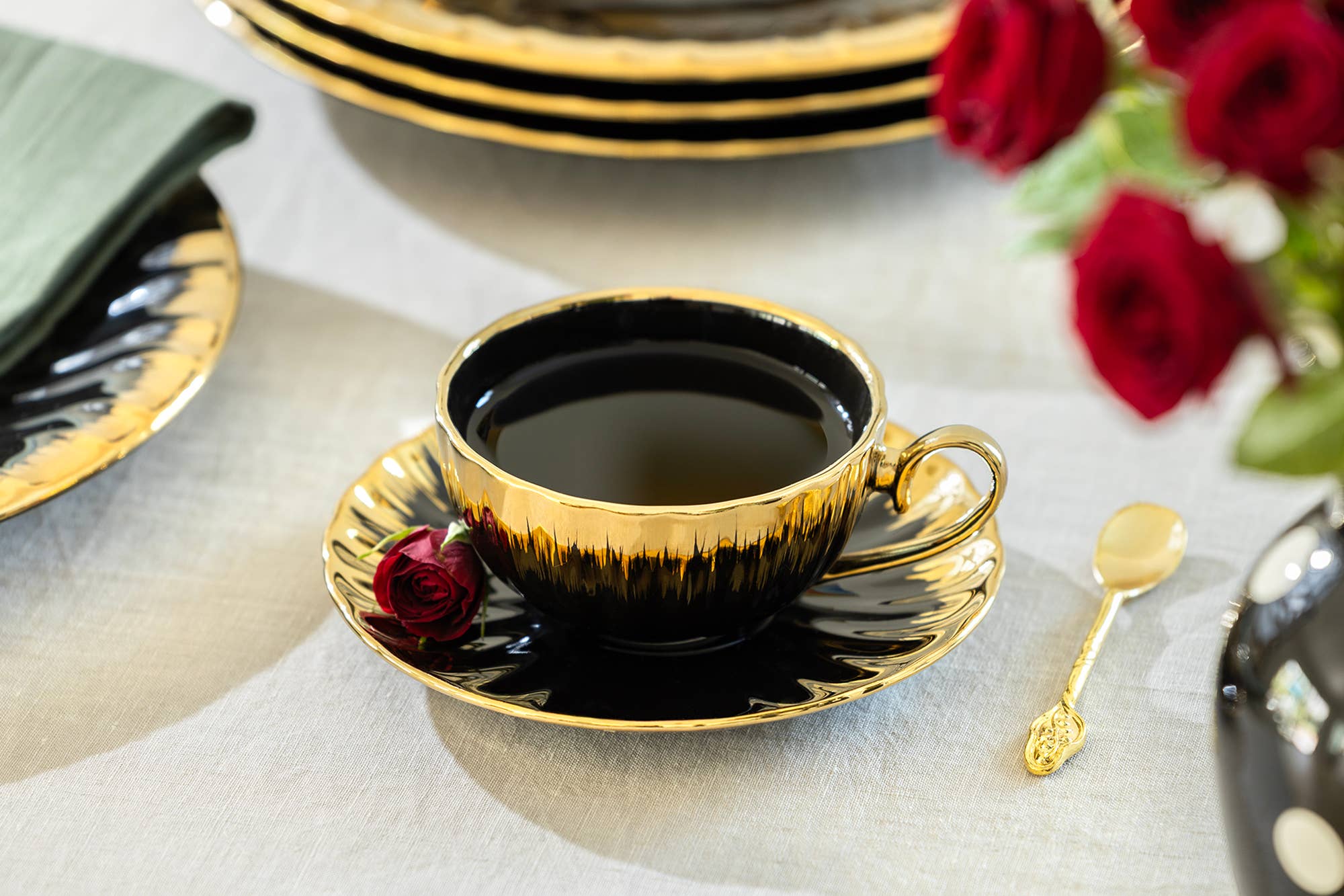 Black Gold Scallop 7oz Fine Porcelain Tea Cup and Saucer