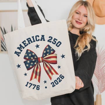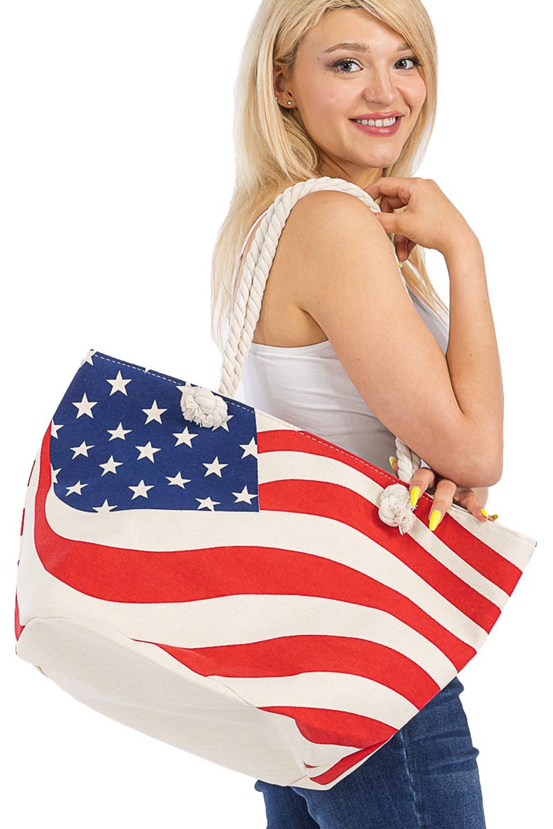 • 100% heavy canvas, 12 oz. • 23" web canvas handles, 10" drop • 20"W x 15"H x 5"D squared off bottom, 24.5L Our popular Americana graphic on the natural canvas tote bag. These are great to use for toting around groceries, books, weekend travel, etc.