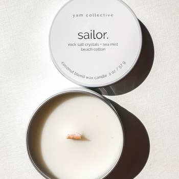 Capture the essence of the beautiful salty ocean with our By The Sea candle. With notes of sea salt, coconut, violet and ozone, this candle will transport you straight to the beach with every light! - 8oz pure soy wax candle in a recyclable/reusable tin - FSC certified wood wick for a clean, even burn - Highest quality, non toxic phthalate and paraben-free fragrance oil and essential oil - Hand poured in small batches in our East Coast studio ♻️ To reduce the amount of waste, our candle tins are made with 25% recycled material and may contain very minor imperfections. *To order a custom amount click on the box and type the quantity you would like*