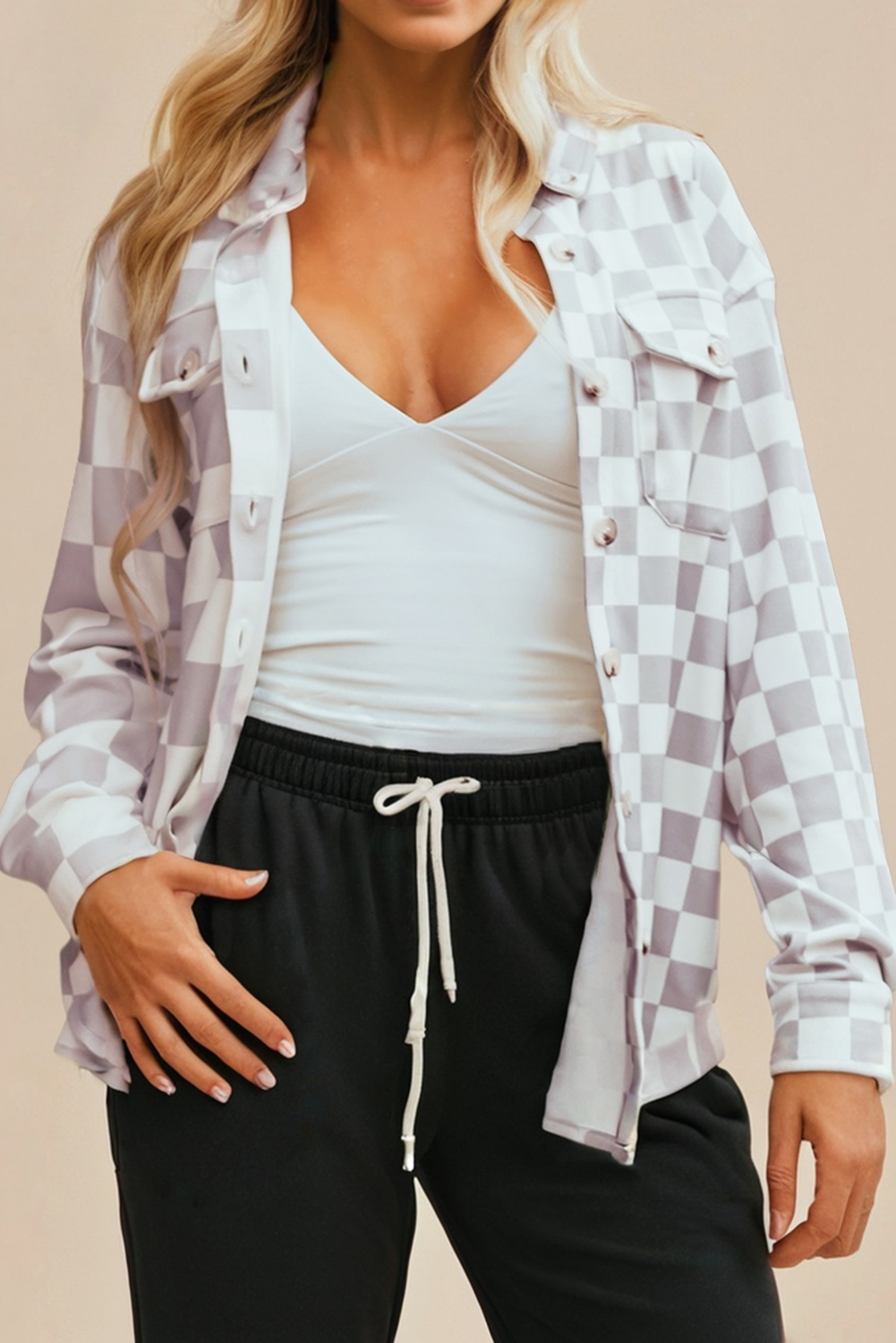 Material 92%Polyester+8%Elastane Style Casual Pattern Checkerboard Occasion Daily Season Pre-Fall 🧥 Perfect shacket for layering or solo wear. 🟩 Trendy checkerboard pattern adds style. 👜 Flap pockets offer functional convenience.