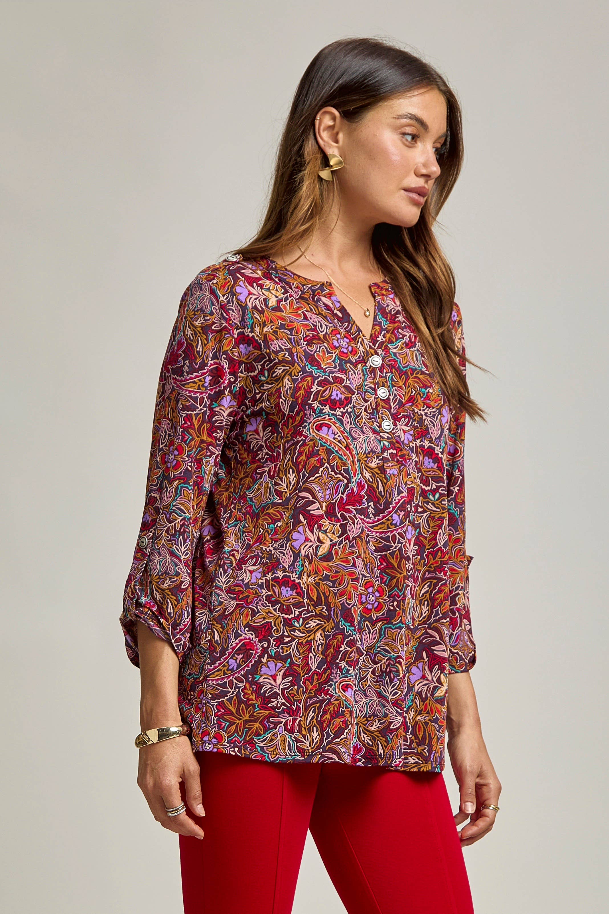 FT13307-P2152 Paisley print chiffon blouse featuring a flared hem. Model is 5'6" and wearing size Small. - Collared - Front button closure - No pocket - No elastic band, smocking - Unlined Shell: 100% Polyester Lining: None