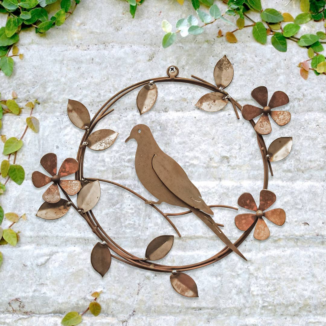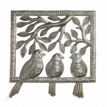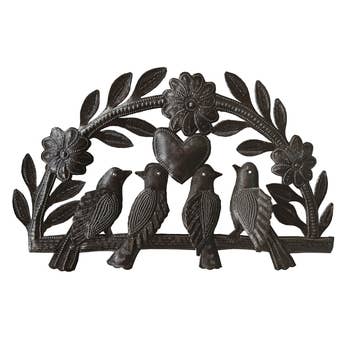 23" x 23" Graceful birds take flight from this lovely globe of flowering vines. Created by Nicolson Mathieu. * Fair Trade Federation-certified steel Haitian metal art * Coated with a protective gloss varnish * Dimensions: 23" x 23" * Handcrafted at the Village Artistique de Noailles in Croix-des-Bouquets, Haiti by Haitian metal artists A folk art that dates back to the mid-20th century, Haiti metal art today is the art of recycling and transforming discarded steel oil drums into ornate metal artwork. As handmade Haitian metal art, there will be slight variations from one piece to another, adding to the unique character and value of each piece of metal art.