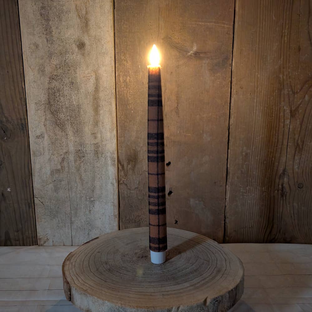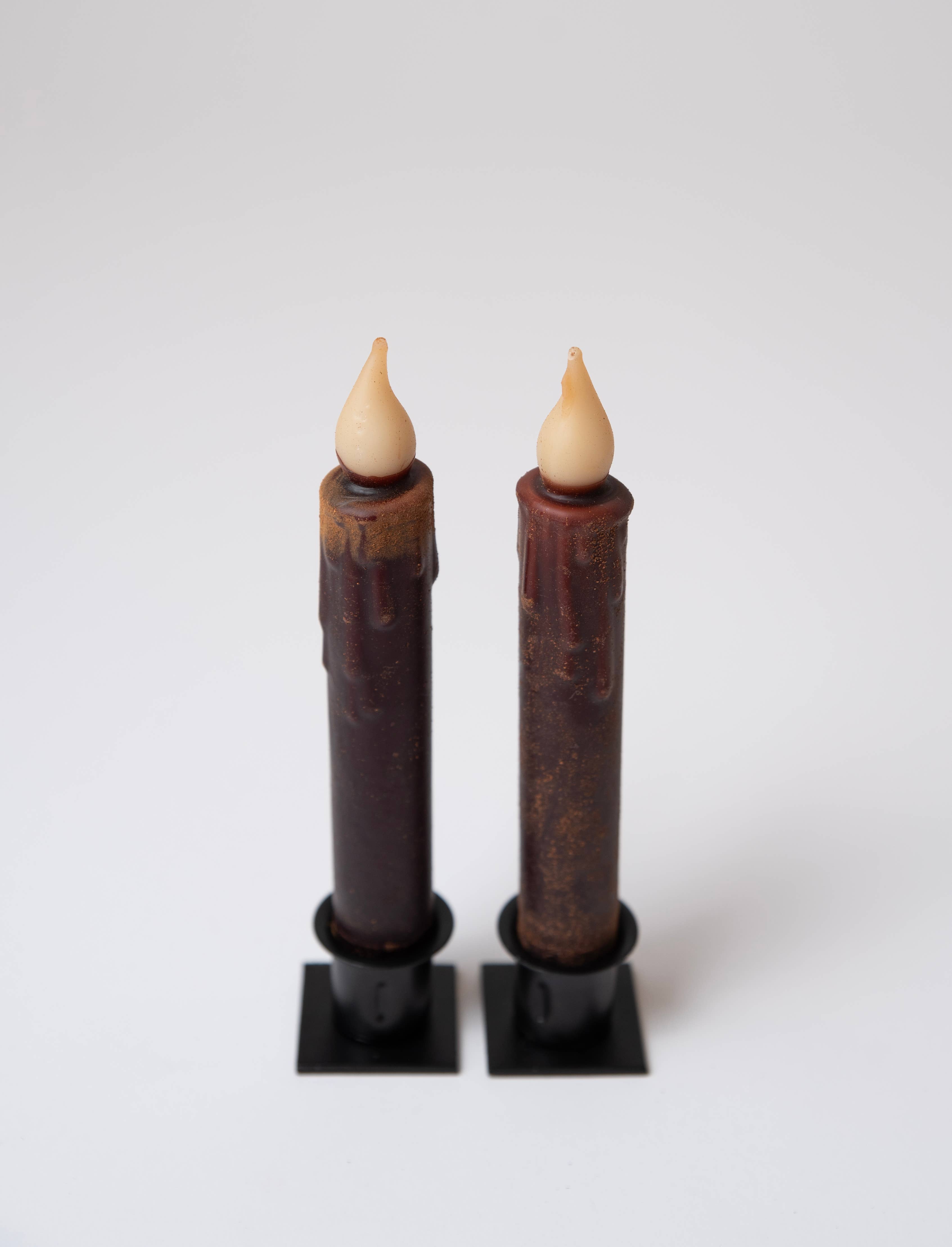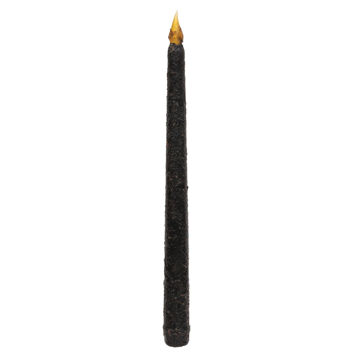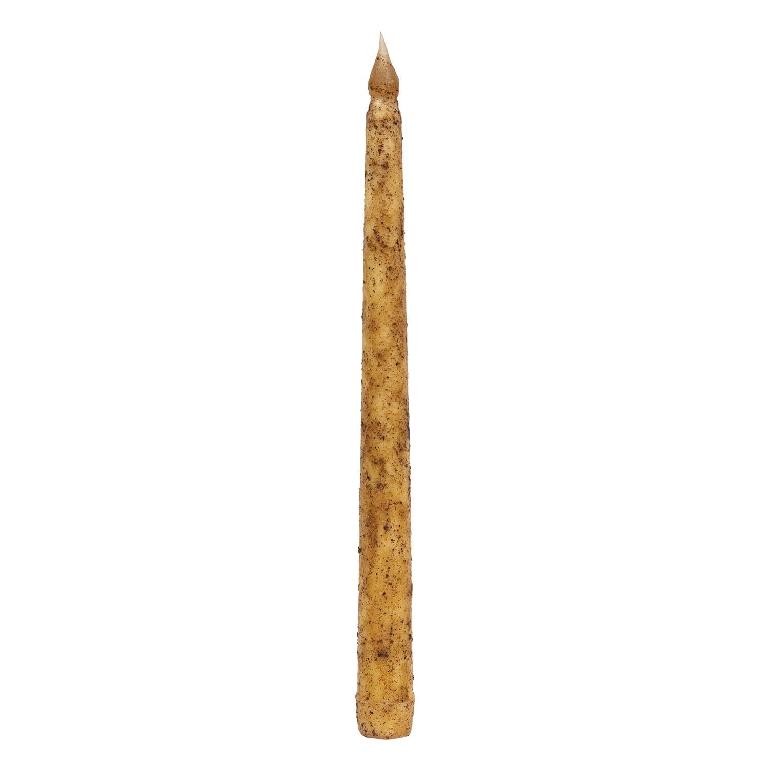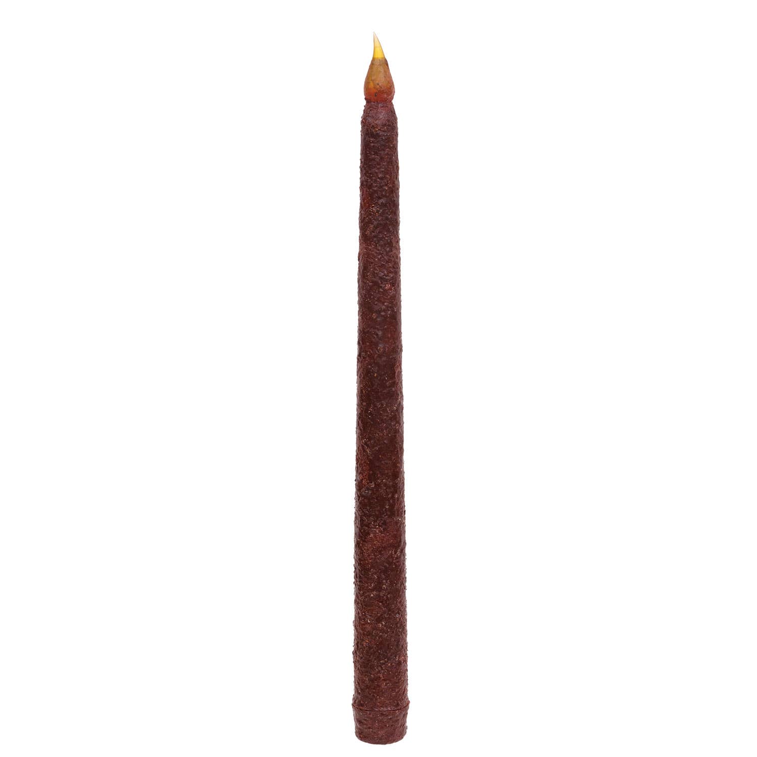 Our 10.75" Burnt Mustard Slender Timer Taper is made of wax with a rustic look and a lightly textured surface. The flame-shaped light has a flickering glow for added realism. Measures 10.75" tall with a 0.75" diameter. Each candle comes wrapped in a paper sleeve which includes product information and a bar code. Our timer candles light for 6 hours, automatically shut off for 18, and then repeat the cycle. Simply twist the bottom of the candle to light. To reset, turn off and turn back on at desired time. Requires 2 AAA batteries, not included.