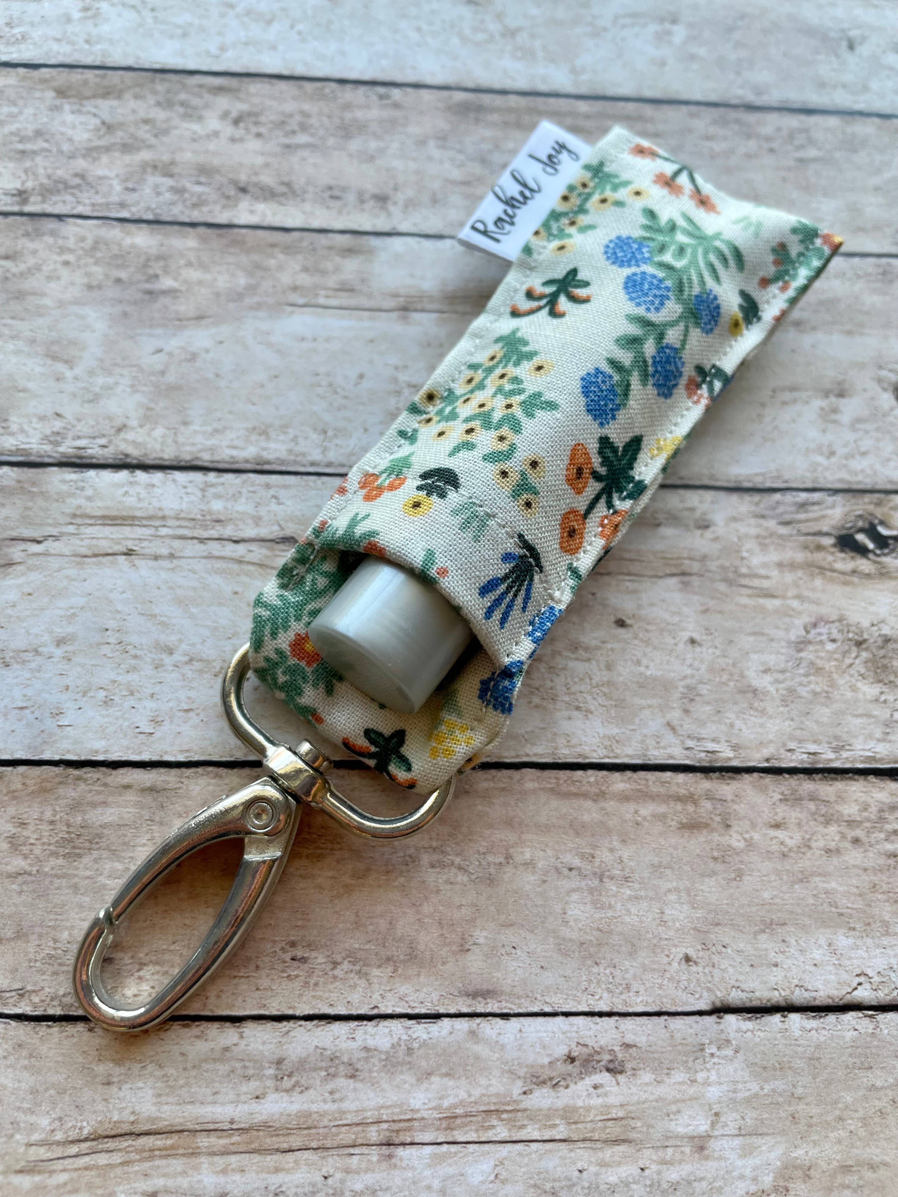 Convenient way to keep lip balm handy on the go! Clips easily onto keyring, purse, backpack, coat, etc. Holds standard size lip balm. This holder features a beautiful Rifle Paper Co. colorful floral print on a light green background. Hardware is black. Exact variations in fabric may vary. * Lip balm not included.