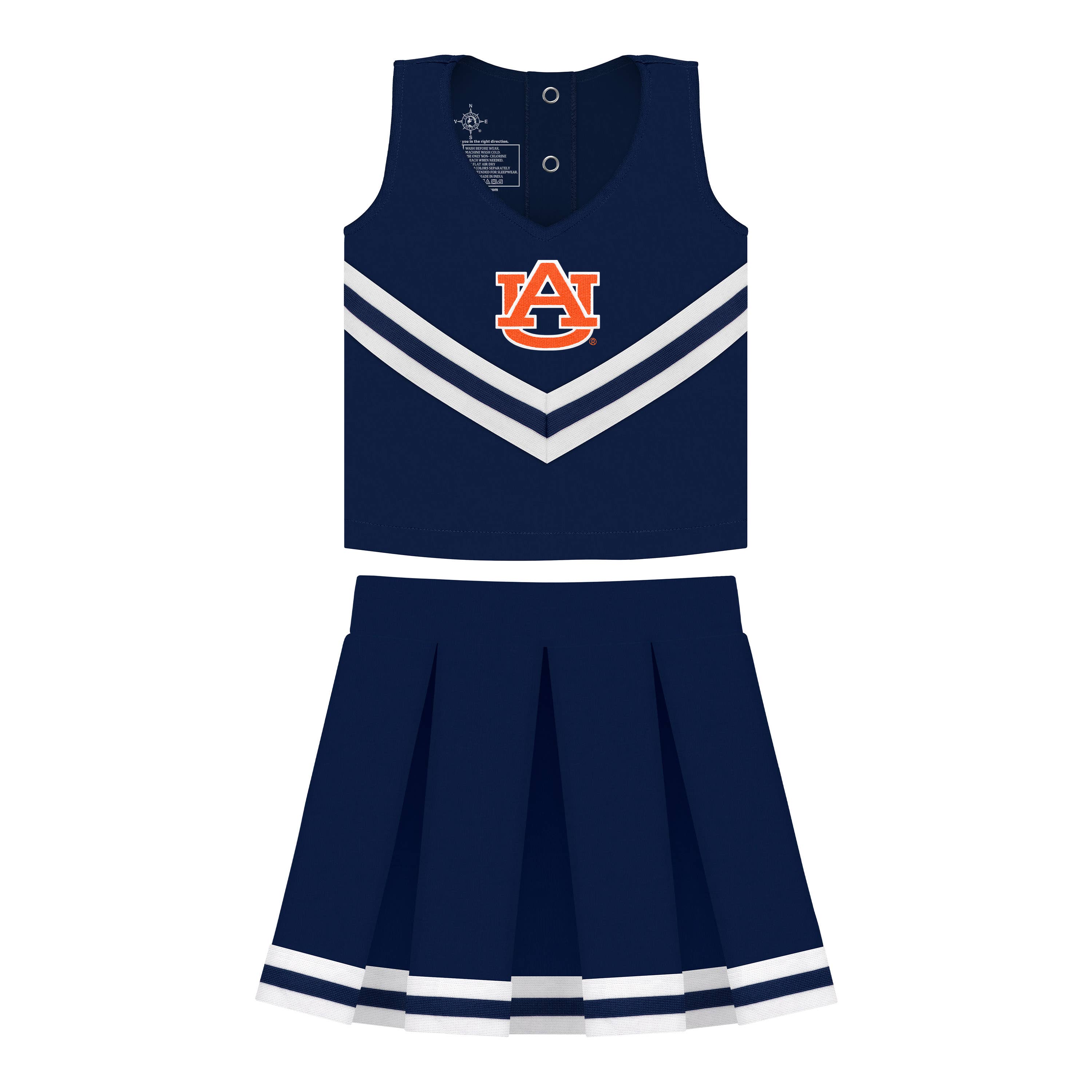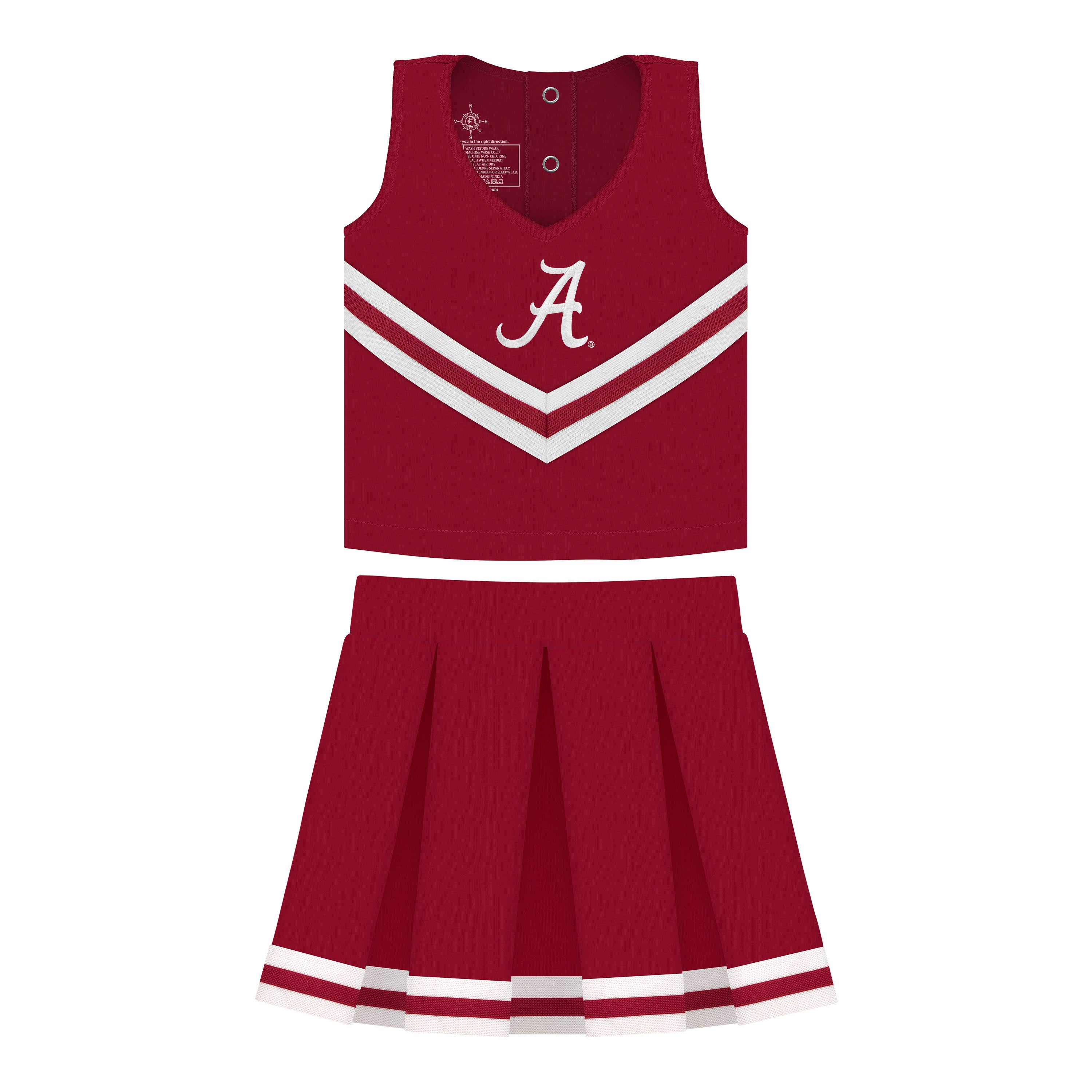 -Officially licensed -100% polyester -Set includes top, pleated skirt with side zipper, and matching bloomers -Featuring team embroidery -Finished assembly in Georgia *Don't see your team? We are licensed with over 300 Colleges and Universities. Message us for more information.*