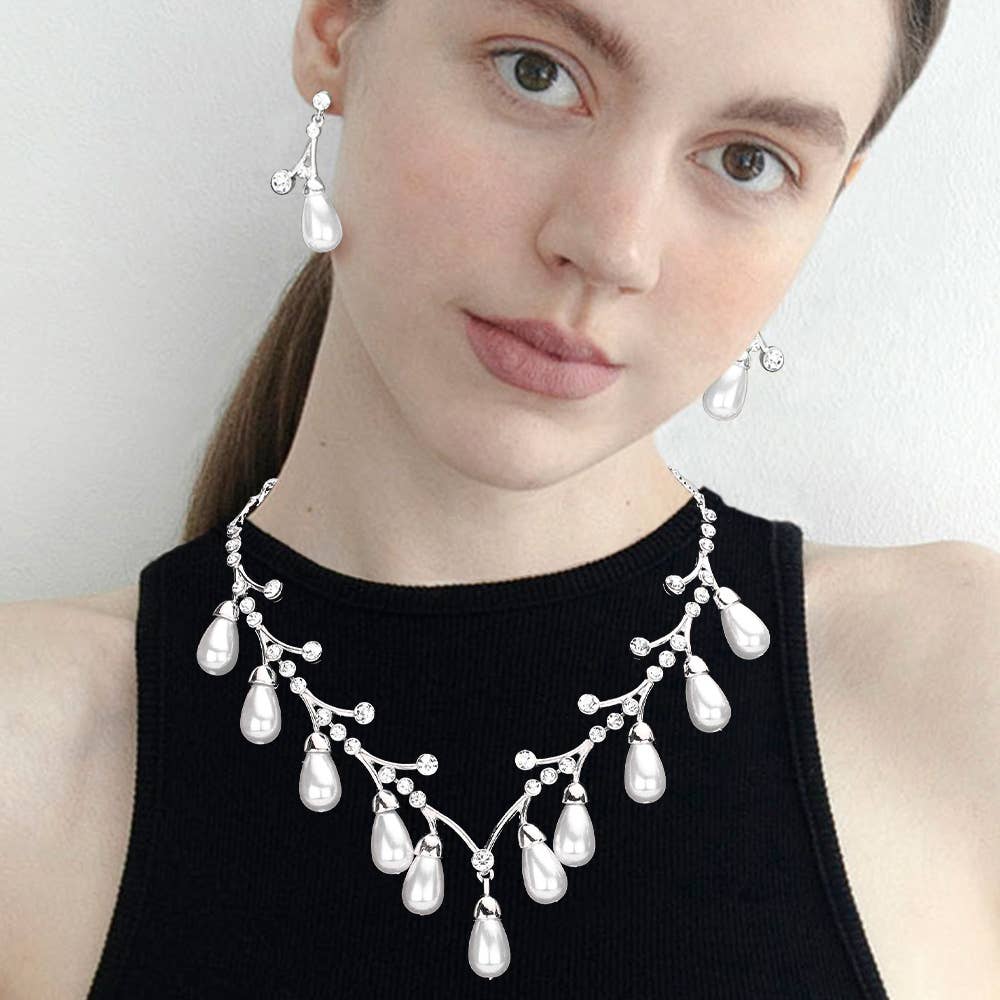 Introducing the dazzling and elegant Silver Crystal Cubic Zirconia with 10mm White Faux Pearl Wire Necklace and Earrings Jewelry Set, perfect for adding a touch of sophistication to any outfit. This exquisite set combines the timeless elegance of pearls with the shimmering beauty of crystals, creating a captivating piece that is sure to turn heads. Crafted with care and precision, this necklace and earrings set showcases a stunning combination of silver, crystal, and cubic zirconia. The necklace features a delicate wire design adorned with sparkling crystals, leading to a lustrous 10mm white faux pearl pendant that exudes classic charm. The matching earrings beautifully mirror the necklace, completing the ensemble with grace and style.