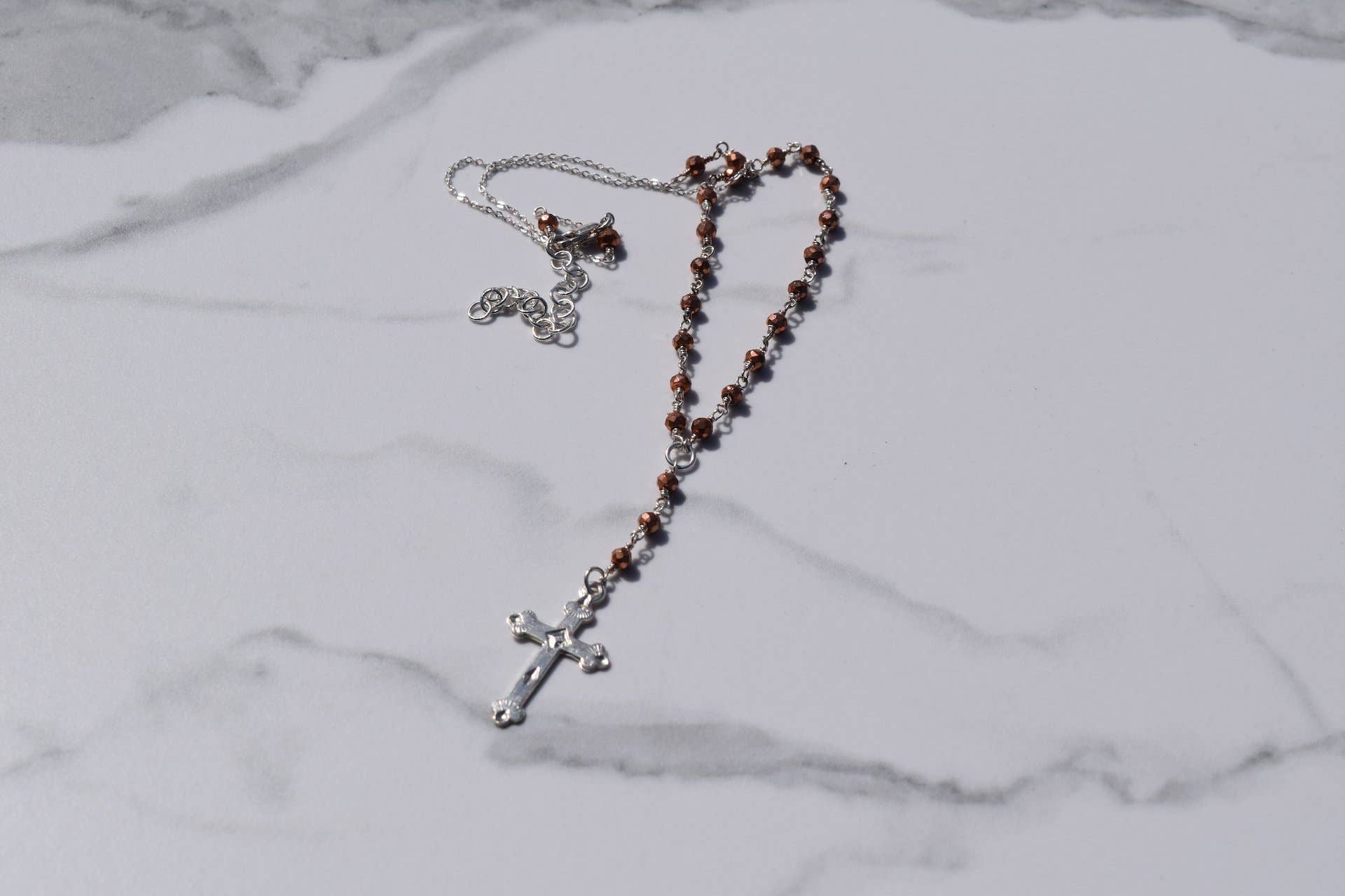 Not your Mama's Rosary! This sparkling beauty is adorned with a dainty cable chain, a traditional Virgin Mary center charm, 15 pyrite beads, and a Herkimer diamond point wire-wrapped by hand. Available in sterling silver & 14k yellow gold fill.Ā The neck opening measures 16 inches plus a 2-inch extender, the top of the center charm to the diamond point is 2 inches. Gold-filled is jewelry composed of either sterling silver or brass as a base metal that is mechanically bonded to a solid layer of gold.Ā For more info visit our "jewelry care" and "FAQ" links.Ā Please allow 3-4 weeks production time unless marked ready to ship.