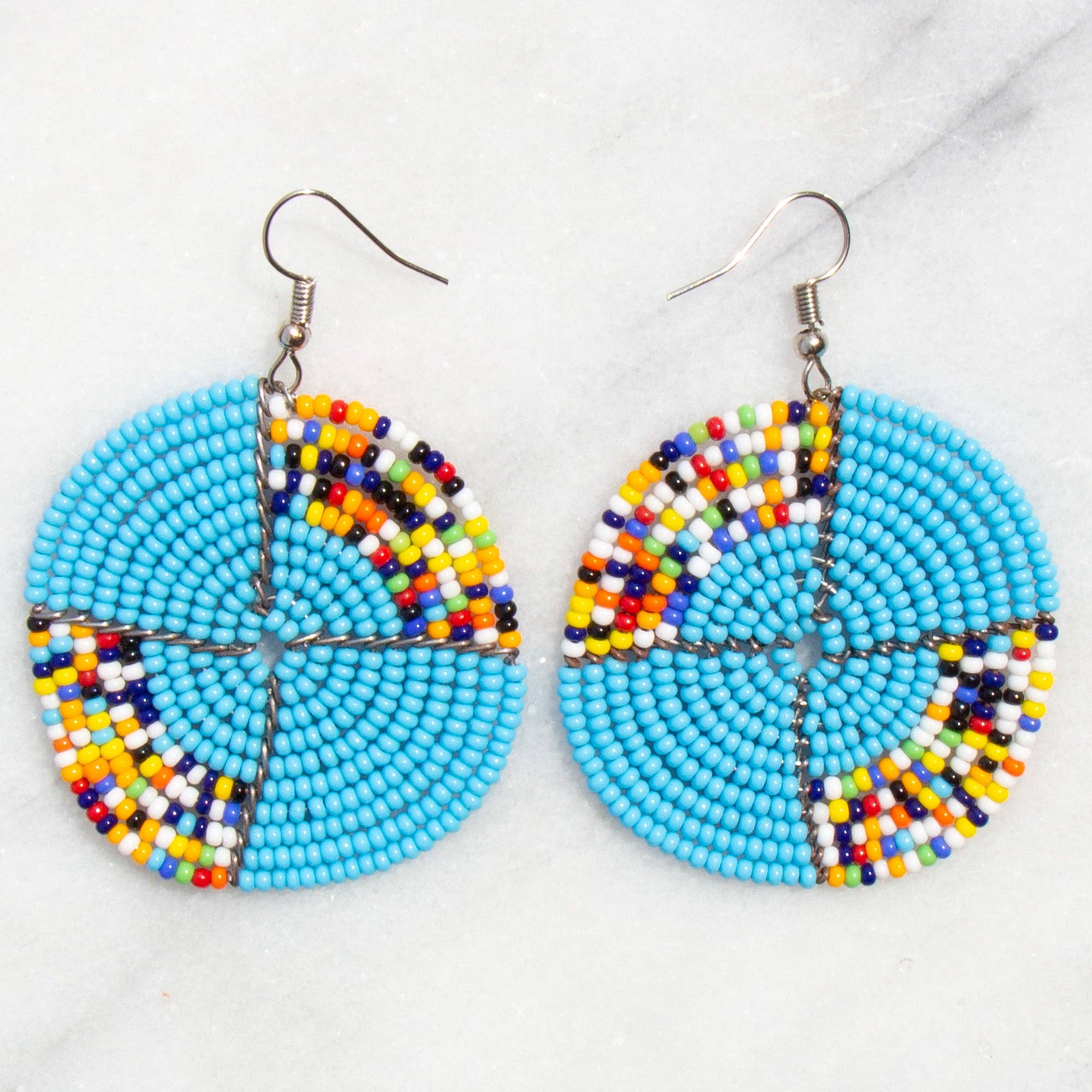 Black and orange Maasai bead double-circle drop earrings are fun and lightweight. * Hypoallergenic hooks. * 3.5-inch drop length * Larger circle: 1.5-inches wide * Smaller circle: 1.125-inches wide Maasai beadwork embodies the whole of Maasai culture representing beauty, strength, tradition, warriorhood, social status and their deep love and devotion for their cattle. The age old artform is practiced by women of the village who learn from their mothers, who learned from their mothers. The women take small glass beads that are laid out on trays and string onto clear threading. From here the designs and beauty explode to create bracelets, earrings, and necklaces. Did you know each color has a symbolic meaning for the tribe? * Red stands for bravery, unity and blood. The red is for the slaughtered cow. * White is for the peace, purity and health. * Blue, signifies the energy and the sky. They believe that with the rainfall it is able to feed their cattle’s and provide proper infrastructure for them. * Orange and Yellow reflect hospitality. Visitors are served cow’s milk from orange gourds. * Green like the earth symbolizes health and land. * Black represents the people and the struggles they endure. All jewelry is crafted by women of the Maasai tribe in rural Kenya. Fair Trade.