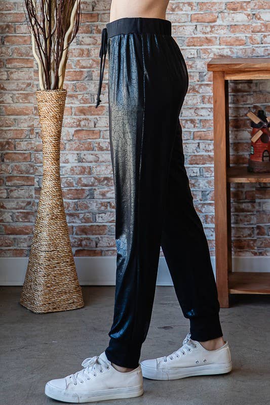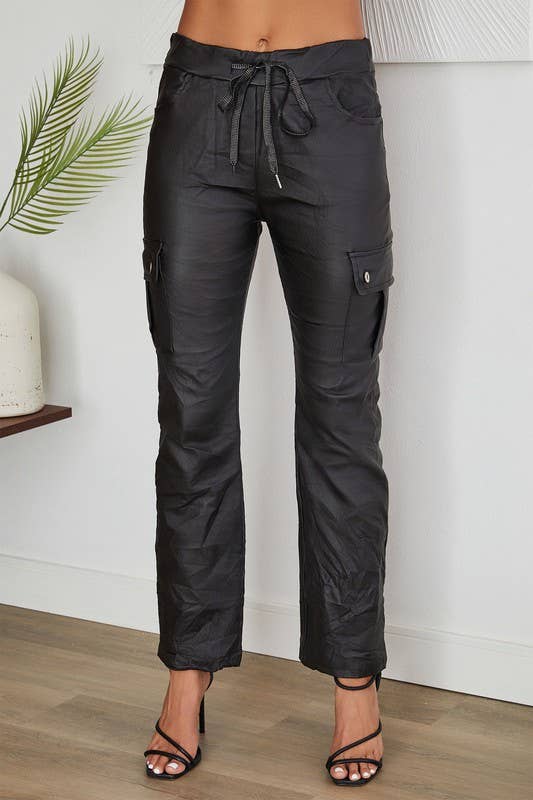 PU DRAWSTRING CUFFED JOGGER WITH POCKETS OUR PU DRAWSTRING CUFFED JOGGER WITH POCKETS IS A STYLISH AND COMFORTABLE CHOICE FOR ANY CASUAL LOOK. THE PU LEATHER CONSTRUCTION IS LIGHTWEIGHT AND BREATHABLE, WHILE THE ADJUSTABLE DRAWSTRING WAISTBAND ENSURES A PERFECT FIT. THE TWO SIDE POCKETS PROVIDE PLENTY OF STORAGE, MAKING THIS JOGGER THE PERFECT CHOICE FOR ANY BUSY DAY.