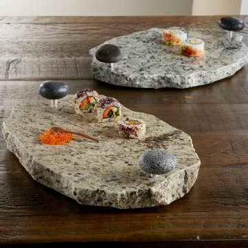 Our Host Delight Chillable Serving Platter is a versatile and eco-friendly piece crafted from reclaimed granite. Its unique, chiseled edge and smooth beach stone handles make it both stylish and functional. Keep your food cool and impress your guests with this exceptional serving platter. Key Features: • Eco-friendly: Made from recycled materials. • Versatile: Perfect for serving a variety of foods. • Temperature-maintaining: Keeps your food cool thanks to granite's natural properties. • Durable: Built to last with high-quality materials. • Stylish design: The chiseled edge and natural stone handles add a touch of elegance to your table. • Includes a wooden serving knife: A complete serving solution. • Handmade Excellence: One of a kind, carefully designed and artisan handcrafted in our New Hampshire studio. • Guarantee: Lifetime material and workmanship guarantee. Stone, granite, and hardwood colors and textures will vary naturally. • Optional Lazy Susan available