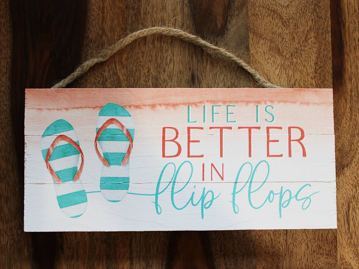 No shoes, no shirt, no problem - floral shirt and orange flip-flops 5" x 10" beach plaques / signs - all can be name dropped. If you want them name dropped, email sales@sjtent.com after you order