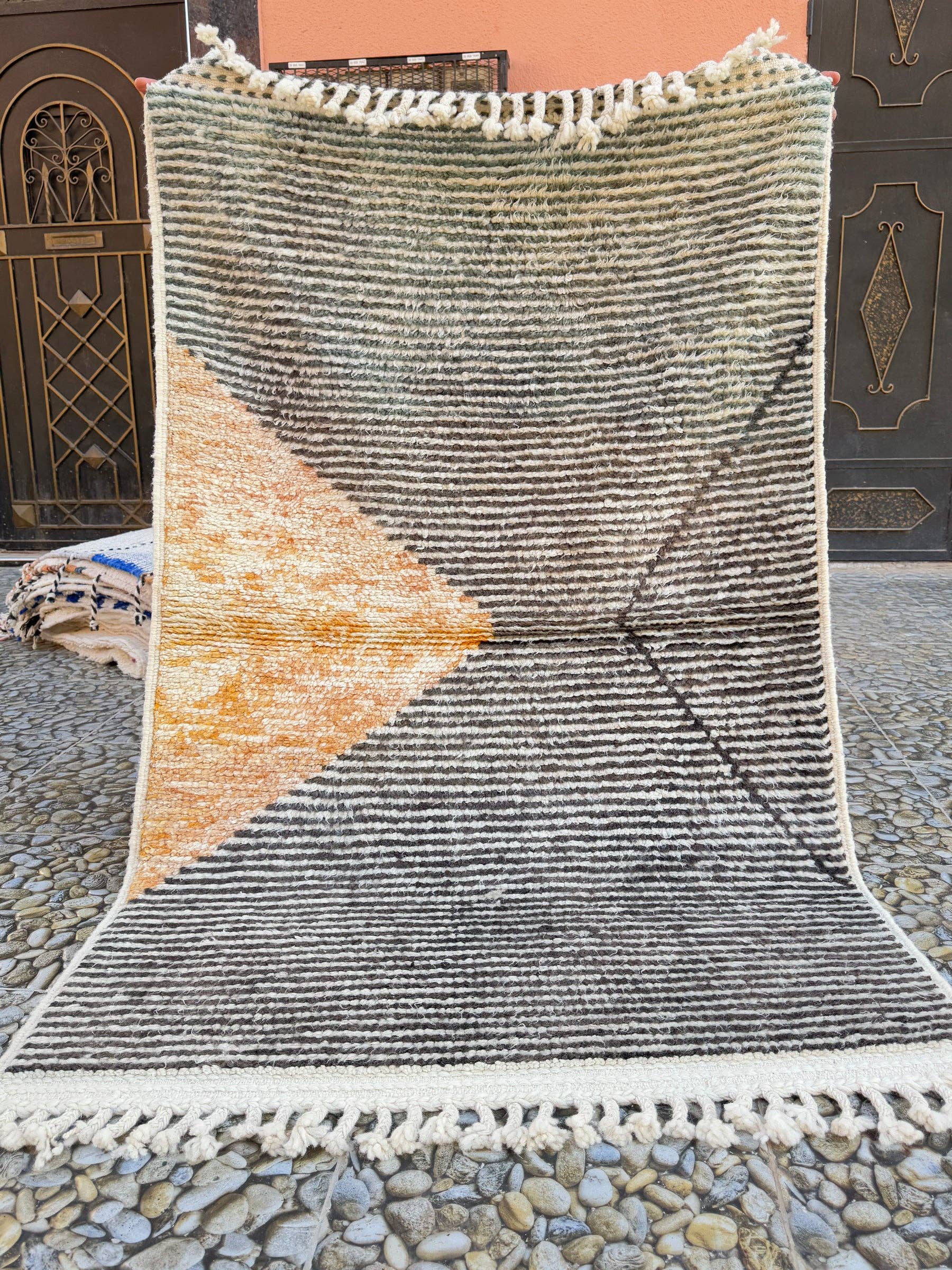Beni Ouarain Berber rug, handmade in Morocco, 100% wool Dimensions: 305/206CM 100% sheep wool Each piece is unique and rigorously sourced by us. Beni Ouarain rugs, traditionally known for their black and white patterns, are evolving today thanks to the creativity of weavers who adapt to contemporary trends. By incorporating touches of vibrant color, they modernize these iconic pieces while preserving their artisanal heritage. This fusion of tradition and innovation offers rugs that not only add authentic warmth to your interior but also a contemporary flair that harmonizes with various decor styles. Choose a Beni Ouarain rug for a unique piece, both classic and decidedly current.