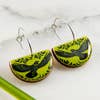 Simple, yet dramatic, these earrings are a daily statement piece! Featuring a bold vintage raven illustration, rendered in sharp black and citron green. Made from sustainably sourced North American hardwood and finished with soy-based, BPA/VOC free resin, these vibrant earrings will bring joy and brightness to any wardrobe. Surgical steel hoop ear wires. Approximately 1.5 inches long.