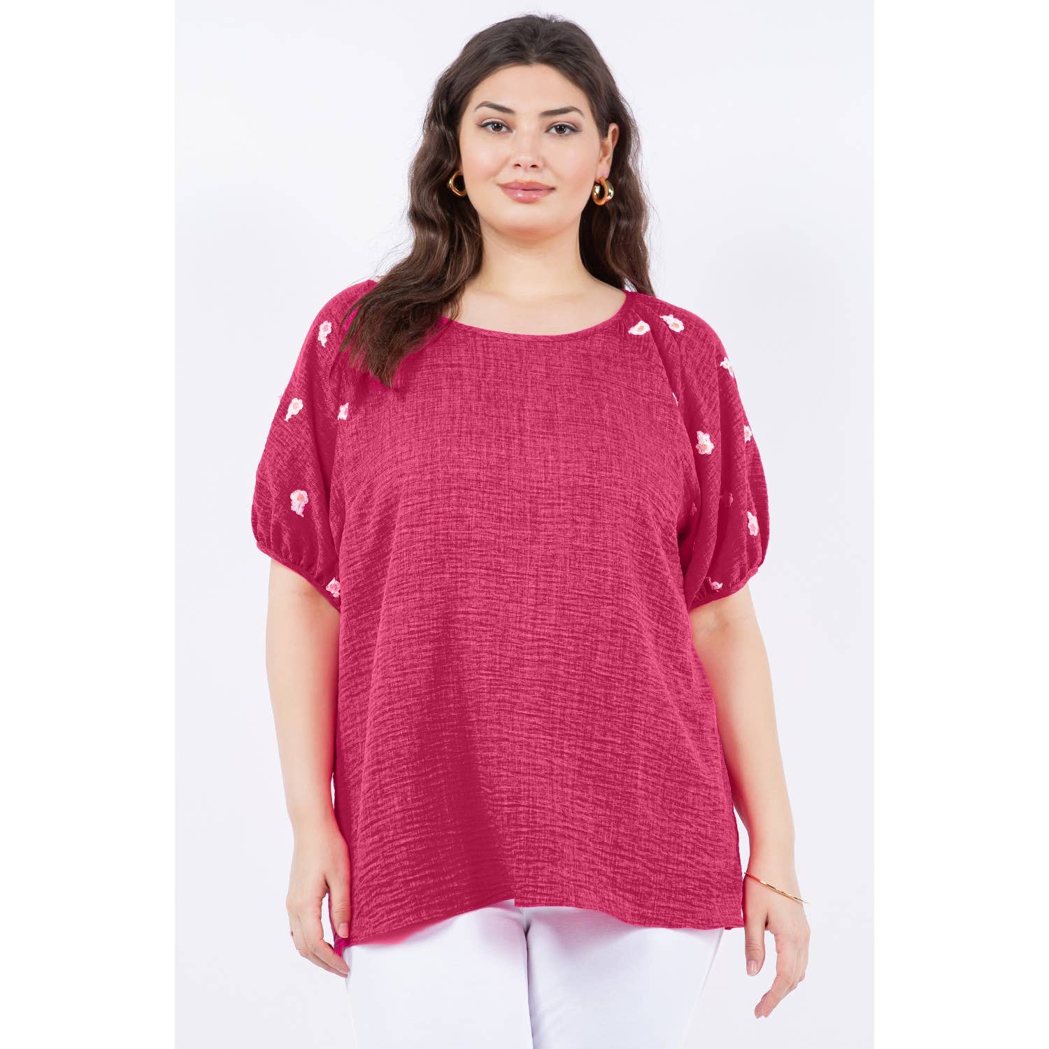 You’ll look lovely in linen when you add the Perri to any outfit. This beauty incorporates crocheted flowers in bloom for a subtle touch of elegance. The cut is a flattering hi-low hem with notch details on the side. She is an easy replacement for a Tee when you want to take your outfit up a notch! Made in Italy. • Scoop Neckline • Short Sleeve • Flattering notched sides • Playful crochet details • One size fits most (REALLY!) *2 – 12/14 • Machine wash cold, delicate, with like colors. Lingerie bag recommended. Hang or lay flat to dry.