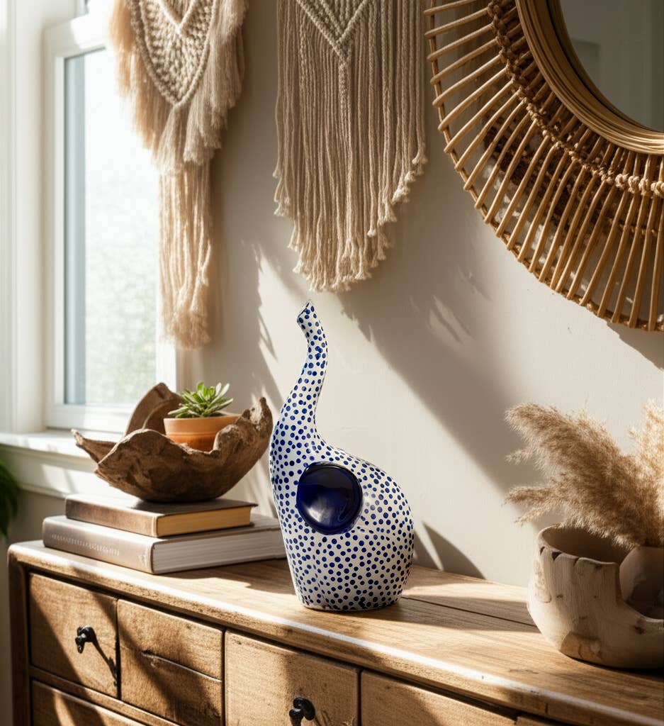 • HANDCRAFTED BOHO CHARM - This ceramic stoneware figurine features a unique, hand-painted design, making it a great statement piece for modern, boho, or eclectic decor styles. Elevate any space with its artistic allure and eye-catching details. • PREMIUM DURABILITY - This figurine is sturdy and long-lasting. Its smooth, glazed finish adds an elegant touch while ensuring resistance to fading, chipping, or scratching, making it perfect for long-term display. • VERSATILE HOME ACCENT - Whether placed on a shelf, coffee table, or mantelpiece, this decorative figurine adds warmth and character. Its compact size makes it ideal for small spaces, offering a stylish touch without overwhelming your decor.