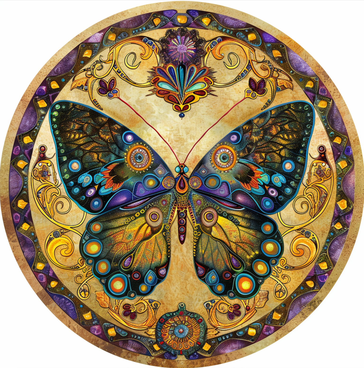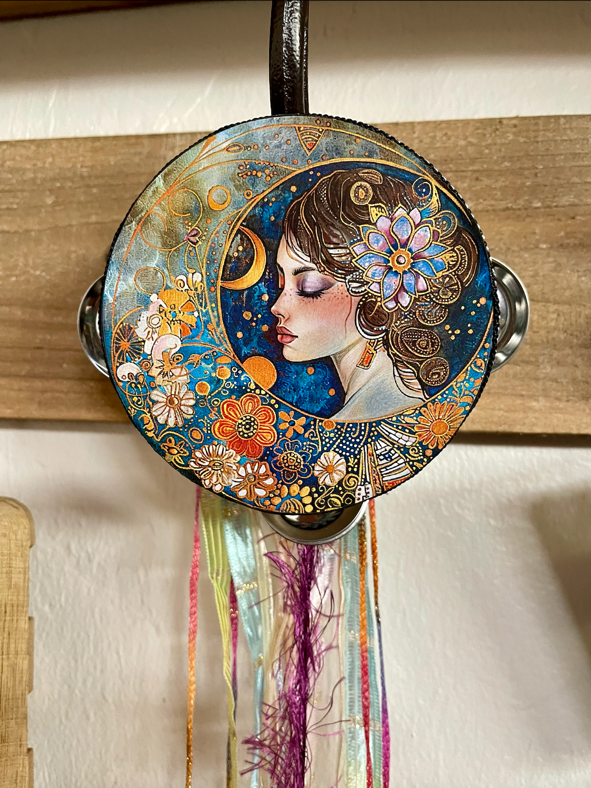 This magical tambourine is a beautiful accent to any sacred space. Quality ribbon and charm complete this 4" diameter tambourine.