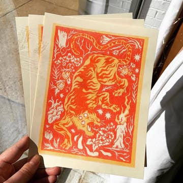 4 color risograph print of all the zodiac animals eating dim sum. Inspired by a trip to Chicago's Chinatown and a love for dumplings this print comes pre-sleeved and with a backing board (with the mad dog studio logo)