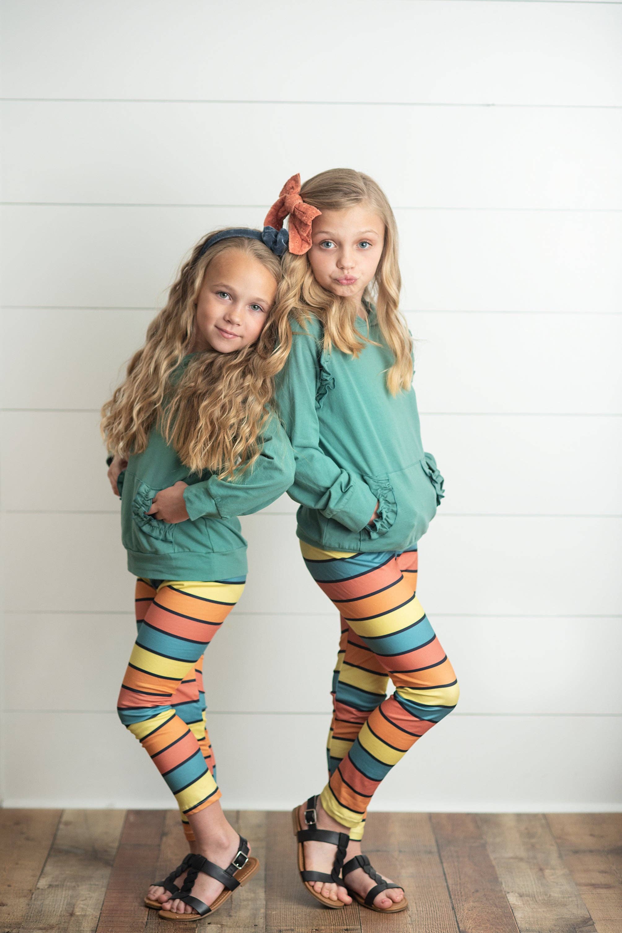 This girls two piece set includes a gray ruffle hooded top with a front ruffle pocket and beautiful rainbow stripe leggings. The Perfect loungewear for snuggly Fall and Winter Days! TOP: 97% Cotton, 3% Spandex LEGGINGS: 95% Polyester, 5% Spandex