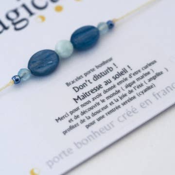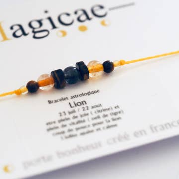 A Piece of Daily Magic Astrological Lucky Bracelet of the Lion Sign full of joy (citrine) and full of vitality (tiger eye) Boost: The Calm of Iolite Its fastener is adjustable (macrame) with 2 beads to fold the wires each stone is natural, there may be color variations It is presented on a card on the back a compliment to discover by scratching with a piece. Maintenance advice: to preserve your lucky charm, avoid contact with water and cosmetics A piece of magic for everyday life