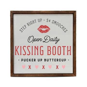 Kissing Booth – 4x6 Valentine’s Decorative Wood Block Sign Add a flirty vintage touch to your Valentine's Day decor with Kissing Booth, a charming 4x6 inch wooden art block bursting with nostalgic romance. Set against a distressed red background with weathered white lettering, ornate scrollwork, and two playful cherubs, this design feels straight out of an old-fashioned love carnival. Crafted on a solid wood block with a rustic finish, this piece stands on its own—perfect for tiered trays, mantels, shelves, desks, or entryway tables. Whether you're decorating for a sweetheart celebration, a cozy home date night, or creating a festive Valentine vignette, this mini sign brings a fun and flirty vibe wherever it goes. Product Features: Size: 4x6 inches (wood block style) Freestanding – ideal for tiered trays, shelves, and mantels Distressed red wood background with white ornate lettering Features vintage scroll accents and adorable cupids Perfect for Valentine's Day