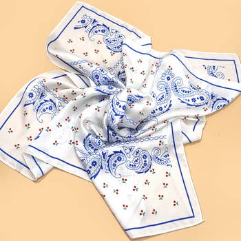 Wrap yourself in elegance with this lovely silky paisley print square scarf. Measuring 26.5 inches on each side it is the perfect blend of style and versatility. Drape it around your neck tie it in your hair or add flair to your bag. Soft lightweight and effortlessly chic for any occasion.
