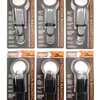 Roughneck Magnifying Nail Clippers. Made with Stainless Steel blades. Professional grade magnifying glass – adjustable 2X magnification! Ergonomically built for easy use. Large size handle. Non slip. Built in nail file. Folds compact for easy travel and storage. Great for finger and toe nails! Made for all ages. It's great for everyday use. Perfect gift idea! WHOLESALE BULK ITEM