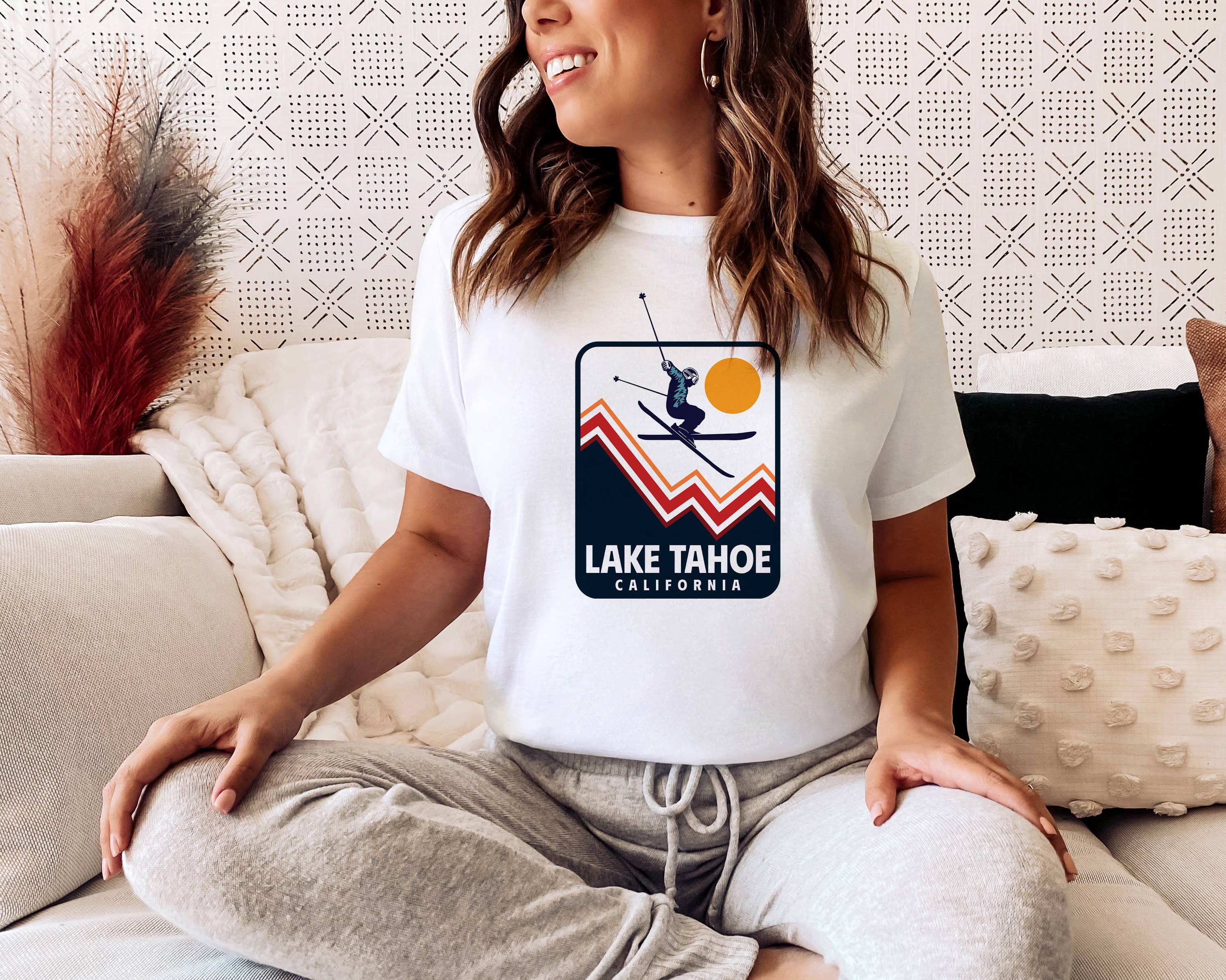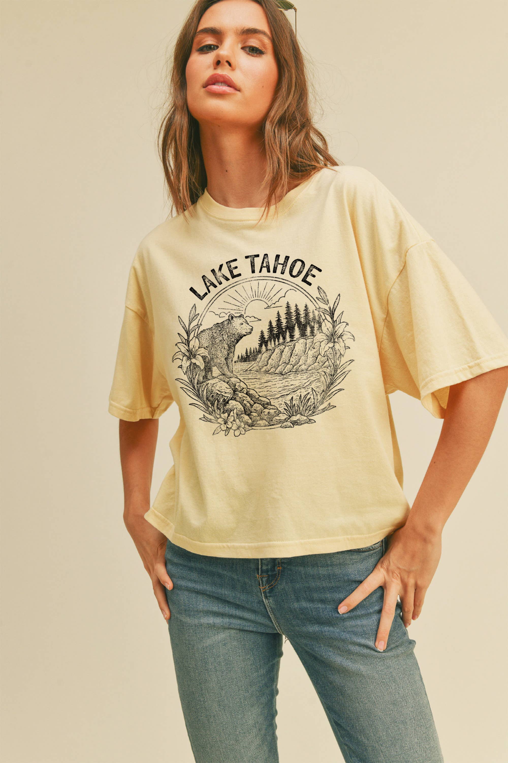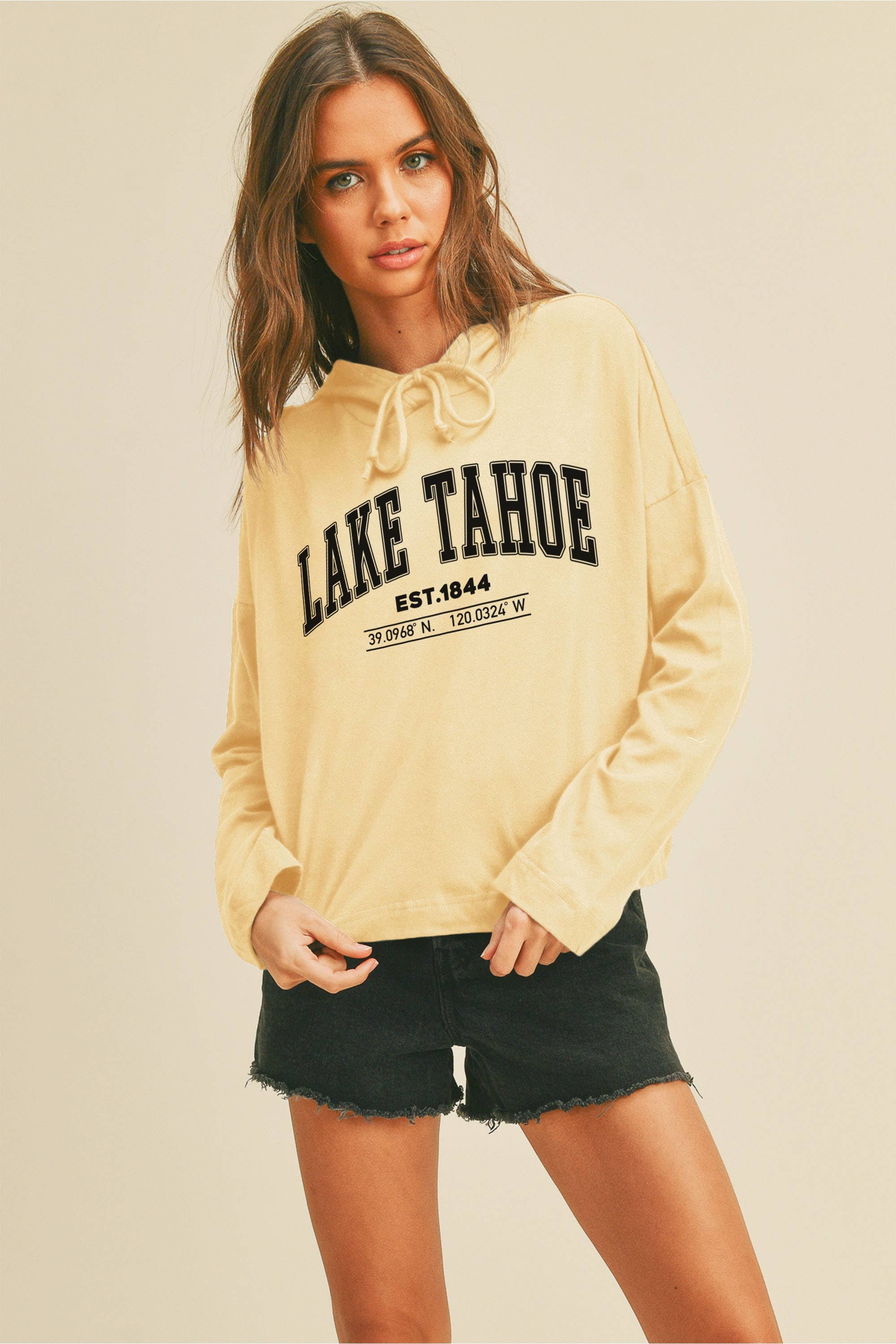 Lake Tahoe Graphic Long Sleeve Hooded T-Shirt - 100% Cotton - 20 Singles Jersey - Built-In Hood - Easy Pullover Style - Boxy & Cropped Body Length - Tear Away Label or Printed Label - Made in Vietnam or Mexico - Printed in USA *DTF PRINT *Colors may vary slightly due to the fabric lot process