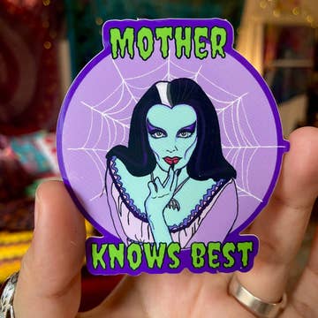 Waterproof "Mother Knows Best” Sticker featuring Lily Munster 💀 waterproof 💀dishwasher safe 💀glossy finish 💀3” x 3” All stickers are 5 for $20 U.S. Shipping is .60 flat International Shipping is $1.40