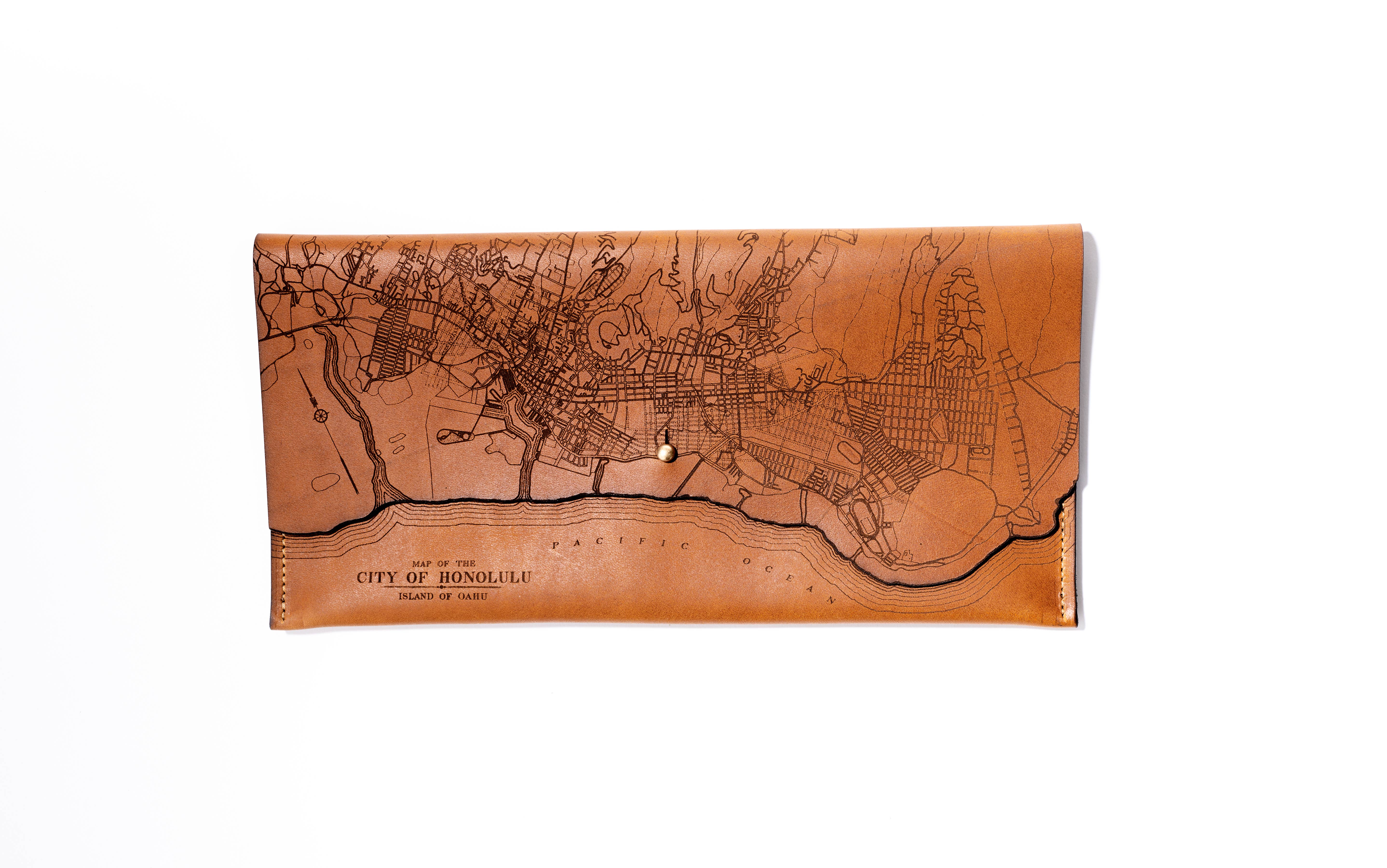 Our Clutches are made in Milwaukee, Wisconsin of locally tanned full-grain leather from Seidel Tanning Co. After laser etching with a 1913 map of Denver, Colorado onto the leather, we machine stitch the clutches with bounded nylon thread and add a solid brass screw stud closure. All edges are beveled by hand with pure beeswax to a gloss finish. This clutch measures 6.75" x 12”.