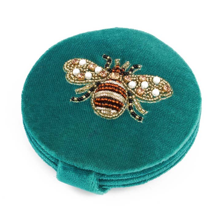 Touch up your lipstick in style with our beautiful compact mirror - featuring a gorgeous hand-beaded pink lipstick motif on a navy blue velvet. -Approximately 80mm diameter and 25mm deep including beadwork. -Featuring 2 mirrors and fastens with a tab popper. -Crafted by artisans in India.