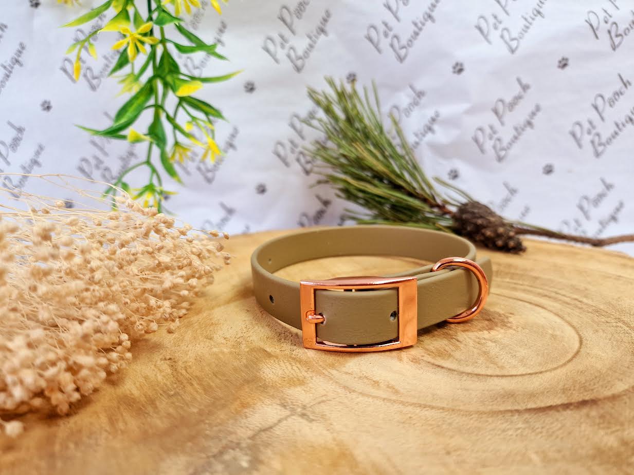 Khaki Biothane Puppy/Dog Lead with Rose Gold or Stainless Steel Fittings- 16mm or 25mm wide This is a BioThane dog lead. BioThane is extremely durable, waterproof, stinkproof, and therefore headache-proof for dog owners. This lead is great for adventurous pups who like to get muddy or go swimming. Vegan, and cruelty-free Available with rose gold plated fittings or stainless steel fittings Standard 41" length (including handle, and clip) Genuine Biothane material, colour code guide: GD52X - coral WH521 - white BL520 - black RD522 - red OR522 - orange OD521 - camel WN521 - red wine PU522 - lavender PK523 - hot pink BU521 - sea salt blue GY523 - grey YE521 - yellow GD521 - gold TN525 - khaki PC524 - coral
