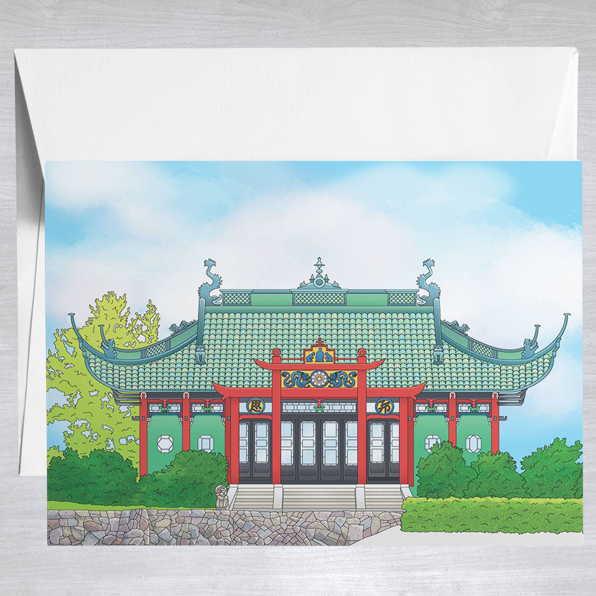 These cards are designed digitally and printed on premium heavyweight linen paper, the inside of the card is blank and it comes with a red envelope to match. Available to purchase individually or as a box set of 5. Overall dimensions: 4" (W) x 6" (H)