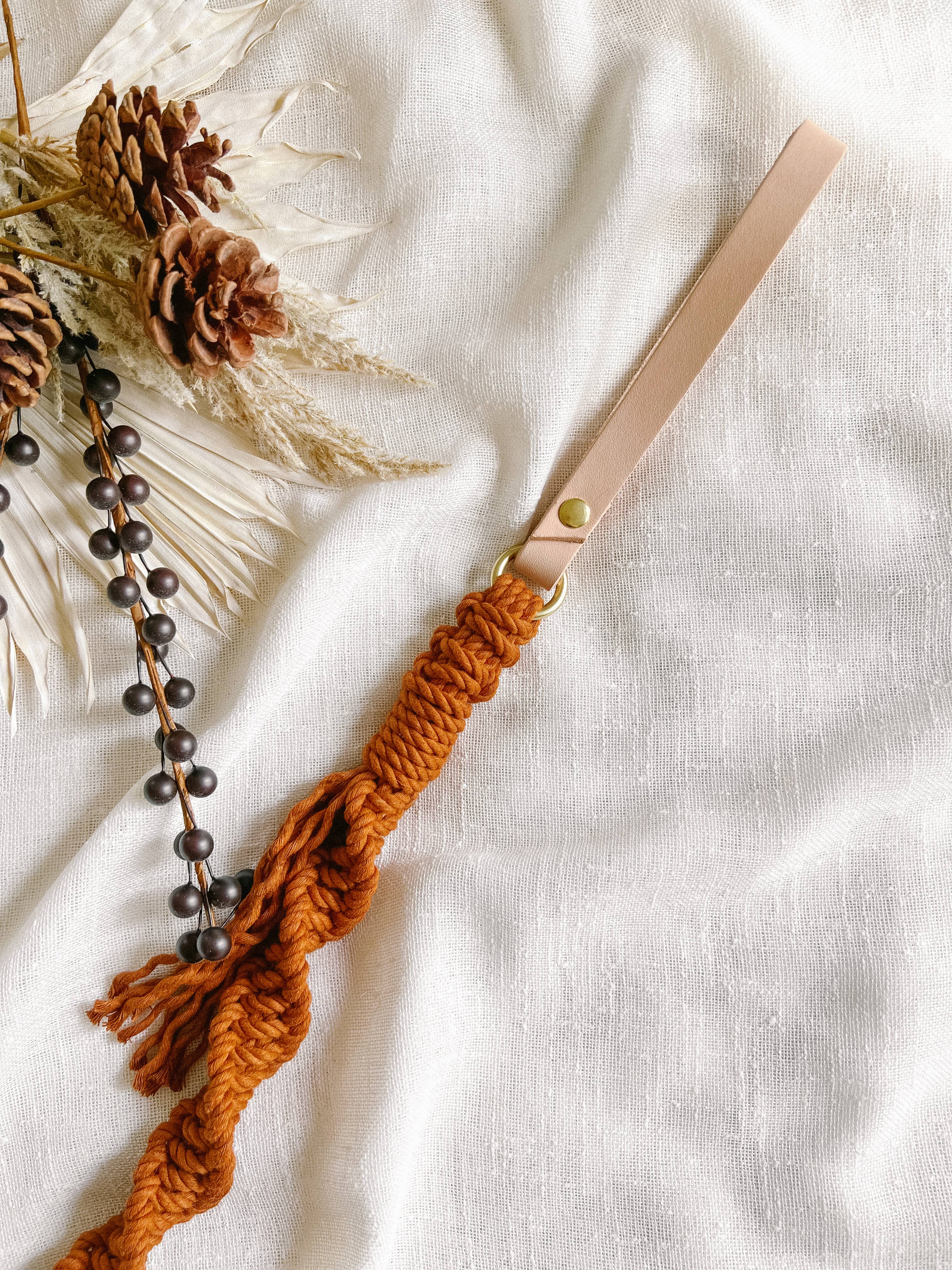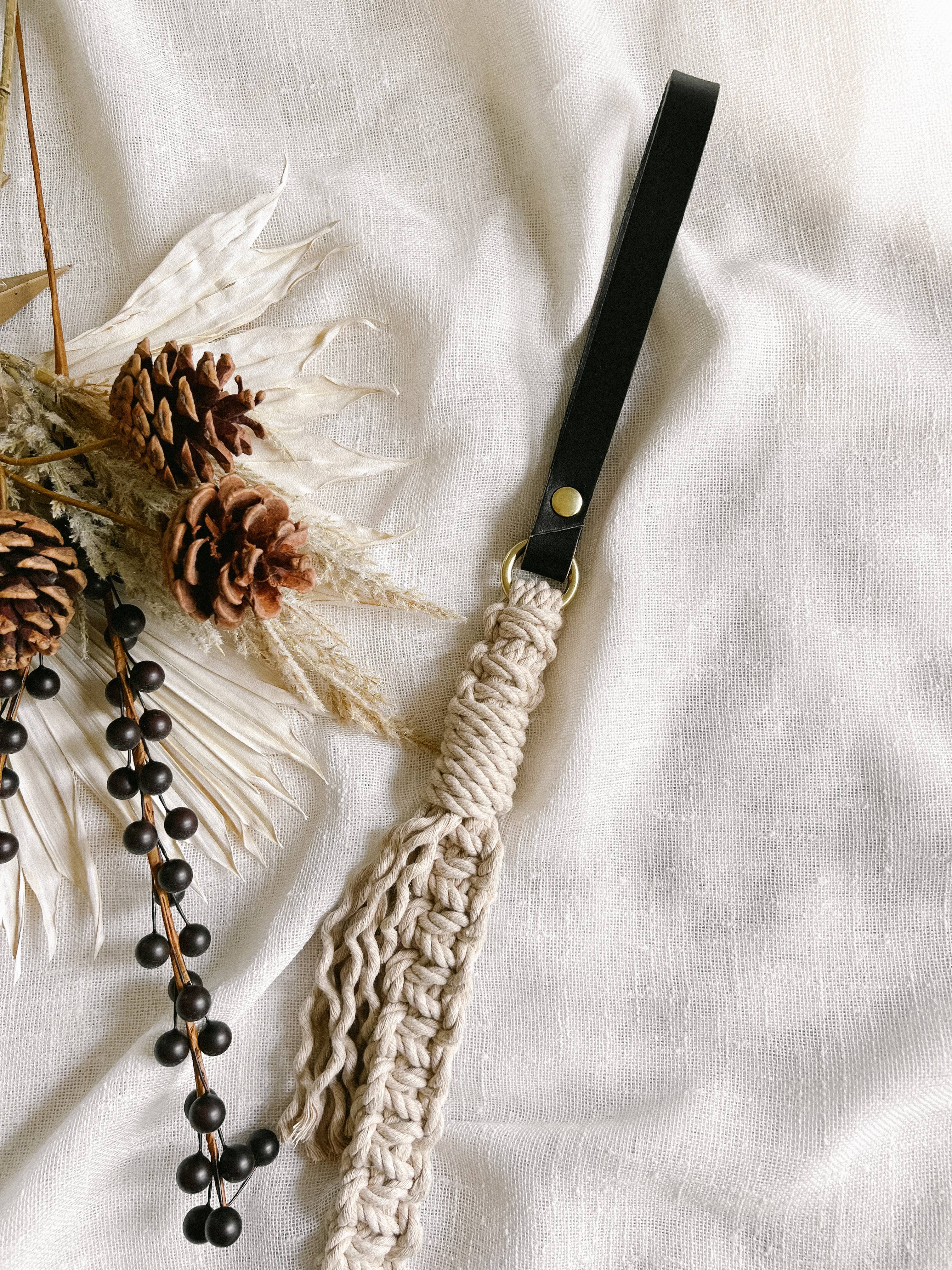 Gorgeous and durable, this is the perfect leash for daily walks, weddings, and family photos. The quadruple knotted rope makes this very strong and sturdy, yet lightweight and comfortable to carry. The leather handle easily fits over your wrist for hands-free walking. All leashes are naturally dyed without chemicals and have Okeo-Tex standard (safe for babies, or fur babies in this case). FEATURES - 100% cotton rope - Genuine leather handle - Solid brass 360-degree swivel snap hook - Solid brass O-ring, perfect for waste bag holders - Two width options for dogs of all sizes, up to 150 pounds - Handmade in Fort Myers, Florida LEASH SIZES - Small (5/8” thick rope): most suitable for small dogs under 15 pounds* - Medium/Large (1” thick rope): suitable for dogs of all sizes *size up for a chunkier look Due to the nature of macrame, small variations in size/design may occur.
