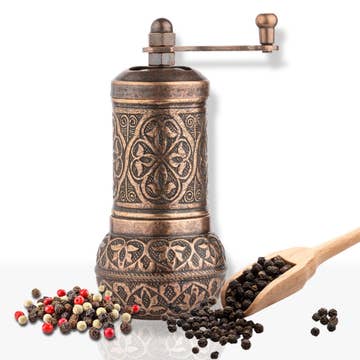 Salt and Black Pepper Grinder, Refillable Spice Grinder, Authentic Vintage Turkish Pepper Mill Decorative, 4.3 in The manual pepper grinder is 4.3 in (11 cm) in height and 1.9 in (5 cm) in diameter. With its optimal size, it adds authentic beauty to your kitchen and dining table and can be carried easily. As it has a versatile usage area, it can be used not only for black peppercorns but also for spice, salt, pink Himalayan salt, coriander, cardamom, mustard, cumin, sumac, etc. However, it is not suitable for big seeds, such as nutmeg or corn, and wet seeds. It has three colors; Bright gold, antique gold, silver, and antique copper. Our product is completely manufactured from zamak alloys, which are the highest quality cast body and blades and has a hand-carved design. 4.3 inches (11 cm) Height Pepper Mill Both Decorative and Functional Fully Metal Body, No Plastics Manually Adjustable from Coarse to Fine Easily Refillable Authentic Ottoman Design No-Risk to Purchase