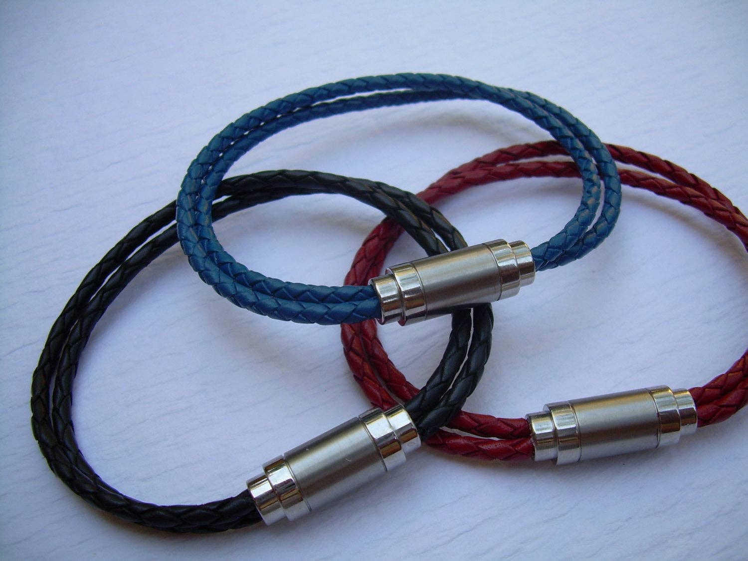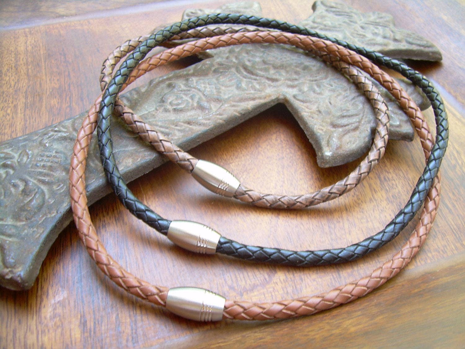 This thick masculine leather necklace with stainless steel magnetic clasp makes the the perfect gift. This necklace style features thick 8mm Premium Quality Braided Leather Cord. This unique cord is made by braiding 8 individual strands of leather. A rugged industrial styled stainless steel magnetic clasp serves as a visual center piece. (22 mm 3/4 inch in length 14mm wide 1/2 inch) Available in: Natural Light Brown, Natural Medium Brown, Natural Dark Brown, Natural Black Be sure to check out the matching bracelet at: https://www.etsy.com/listing/116739061/mens-thick-braided-leather-bracelet-with?ref=shop_home_feat All dyes used in our leather are certified 100% Lead-Free and meet all requirements of the German Goods Ordinance, REACH (European Union), RoSH (U.