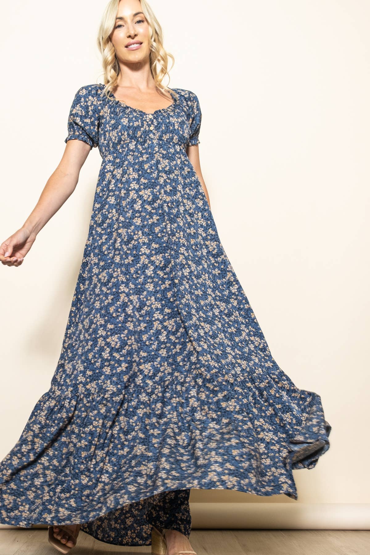 Our women's Spring Floral Wide Flare Smocked Maxi Dress is perfect for embracing the season with style. Featuring a romantic sweetheart neckline and a smocked chest for a comfortable, flattering fit, this dress is finished with 3/4 sleeves for added charm. The extra-flattering skirt and practical side pockets make it a must-have for effortless springtime elegance in your choice of classic off white and dark blue hues Sweetheart Neckline Smocked Chest 3/4 Sleeves Side Pockets Extra Flattering Skirt HPS Length: 57" Model Size Height: 5'9" Bust: 34" Waist: 26" Hip: 35"