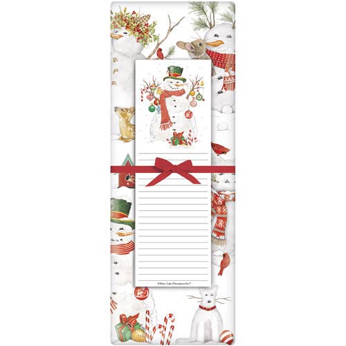 This cute notepad reads, "Please let it snow!" with a whimsical snowman illustration in the corner. The light woodgrain background has plenty of room for writing notes and lists. Ideal for stocking stuffers or gift baskets! Includes a magnet to attach for optional hanging. Measures 5.75" high by 4.25" wide.