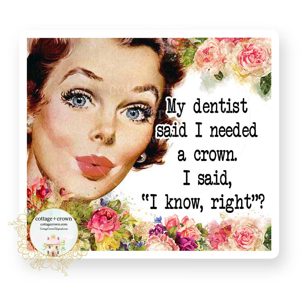 My Dentist Said I Needed A Crown - I Said I Know Right - Vinyl Decal Sticker My custom stickers have richly colored inks on premium, durable, velvety matte finish vinyl. They are waterproof & dishwasher safe, are UV protected, scratch resistant and can be used both indoors & outdoors. Each sticker measures at least 3" on its longest side. Add them into or use instead of greeting cards for a fun surprise or use these stickers on: Laptops, car windows + bumpers, water bottles, binders, lockers, musical instruments and their cases, mirrors, windows and more! Any hard surface will do! Collect them all, it is the same shipping fee to ship one or more! No limit! 100% made in the USA - Happy Dance! Applause! *ships within the US only - watermark & logo will not appear WHOLESALE and CUSTOM ORDERS ARE AVAILABLE