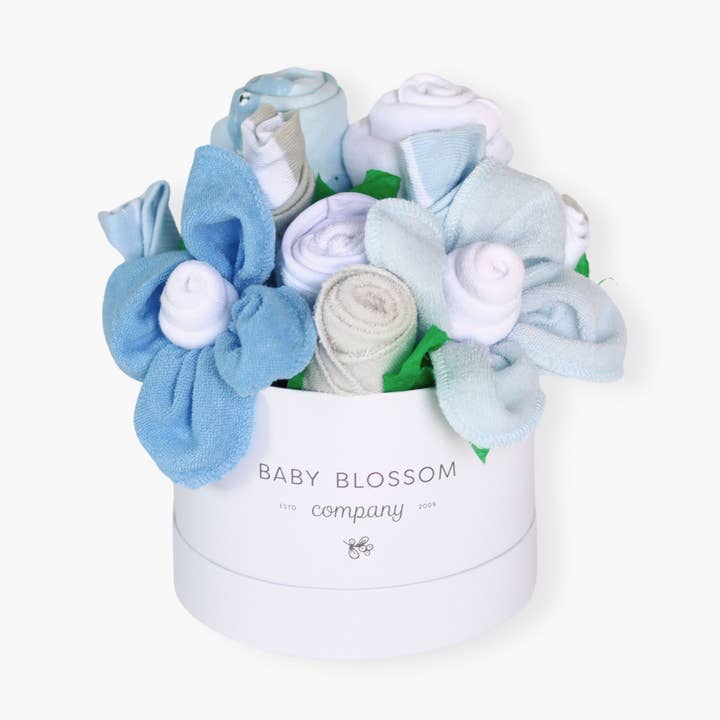 Celebrate the new mom or mom-to-be in the best way possible with flowers that are practical and oh-so-adorable! The Blooms: DELUXE: 1 sleeper 2 bodysuits 1 pair of pants 2 burp cloths 1 bib 4 washcloths 4 pairs of socks 1 disposable diaper CLASSIC: 1 sleeper 1 bodysuit 1 pair of pants 1 bib 1 burp cloth 2 disposable diapers 3 pairs of socks 3 washcloths PETITE: 1 bodysuit 1 bib 1 burp cloth 3 washcloths 3 pairs of socks Clothing is size 0-3 months. SIZING: Petite: 6.5 inches tall & 5 inches wide Classic: 8 inches tall & 6 inches wide Deluxe: 9 inches tall & 7 inches wide Width is measured at the base of the box. Bouquet expands another 1-2 inches in width at the top. Our bouquets are handcrafted, so please allow for slight variations in size and shape. Bouquet comes wrapped in cellophane and tied with a coordinating bow. Gift tag is included with space for a gift message and content details on the back.