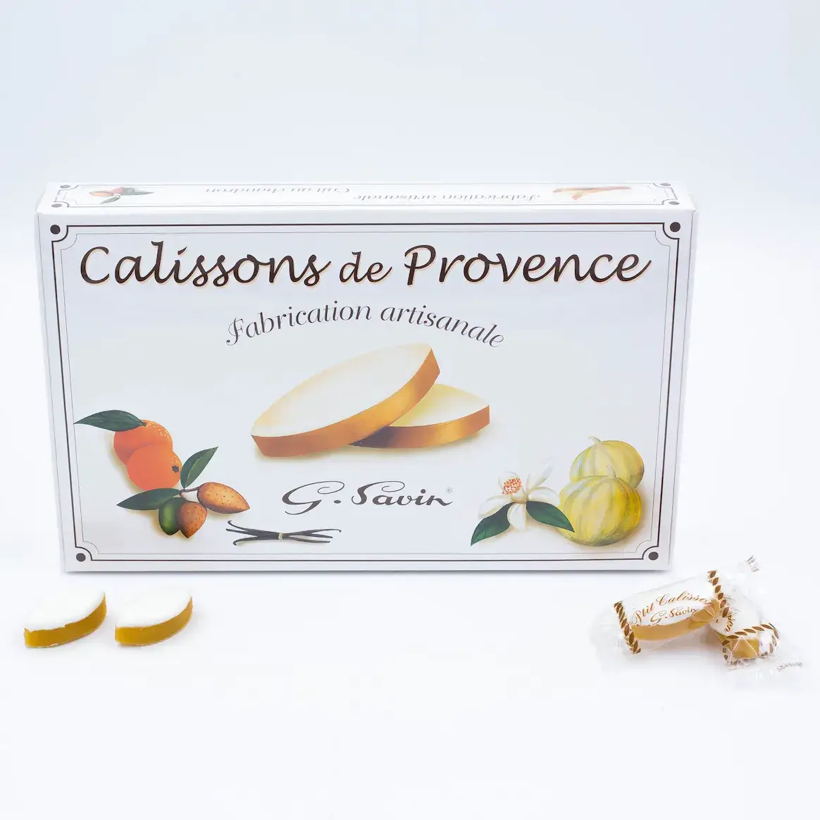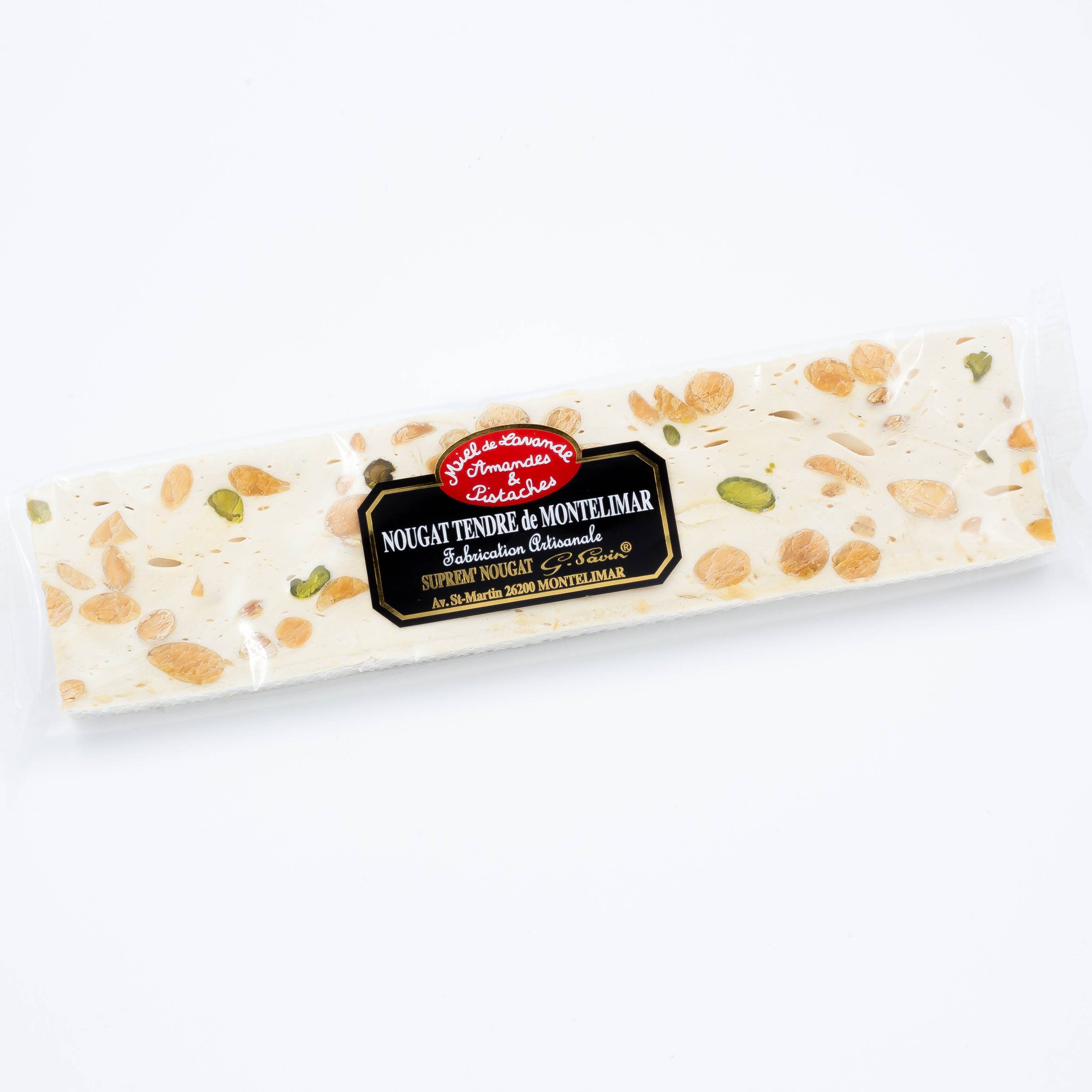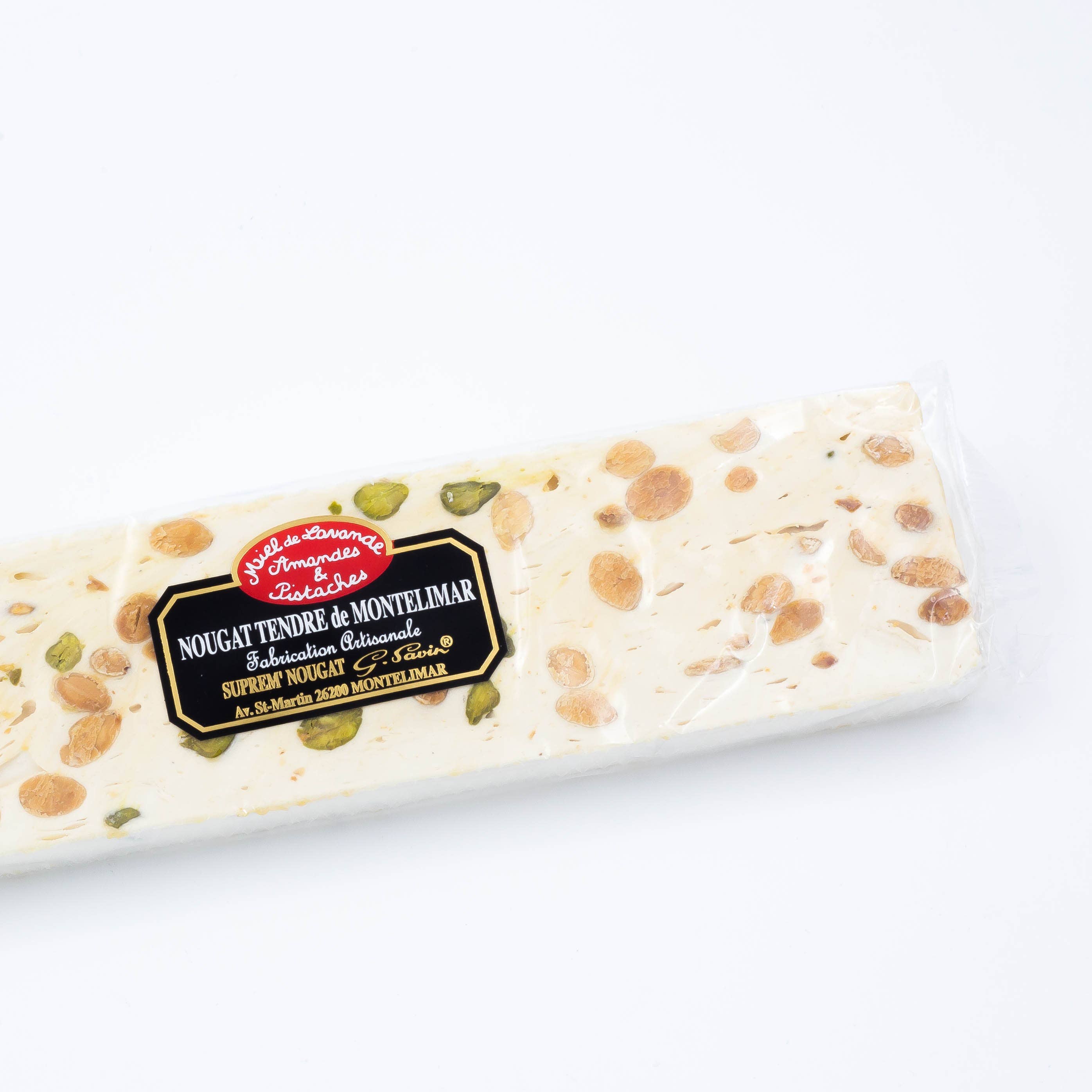 Soft nougat bars composed of 25% lavender honey and 30% almonds - 500g List of ingredients: Almonds (28%), sugar, lavender honey (25% sweetening matter), glucose syrup, pistachios (2%), communion wafers (92% potato starch, water, vegetable oil), egg whites, natural vanilla flavor DLC: 1 year
