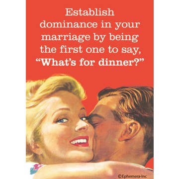Bring humor into your everyday life with Ephemera's Magnet-Establish dominance in your marriage by... This rectangular magnet is designed to make you giggle, chortle, snicker, and guffaw. Perfect for your fridge or locker, it's a great conversation starter with its brutally honest, sarcastic, and hilariously offensive commentary. Ephemera's products are known for their wit and this magnet is no exception. It's more than just a novelty, it's a fun way to express your personality and bring laughter into your home.