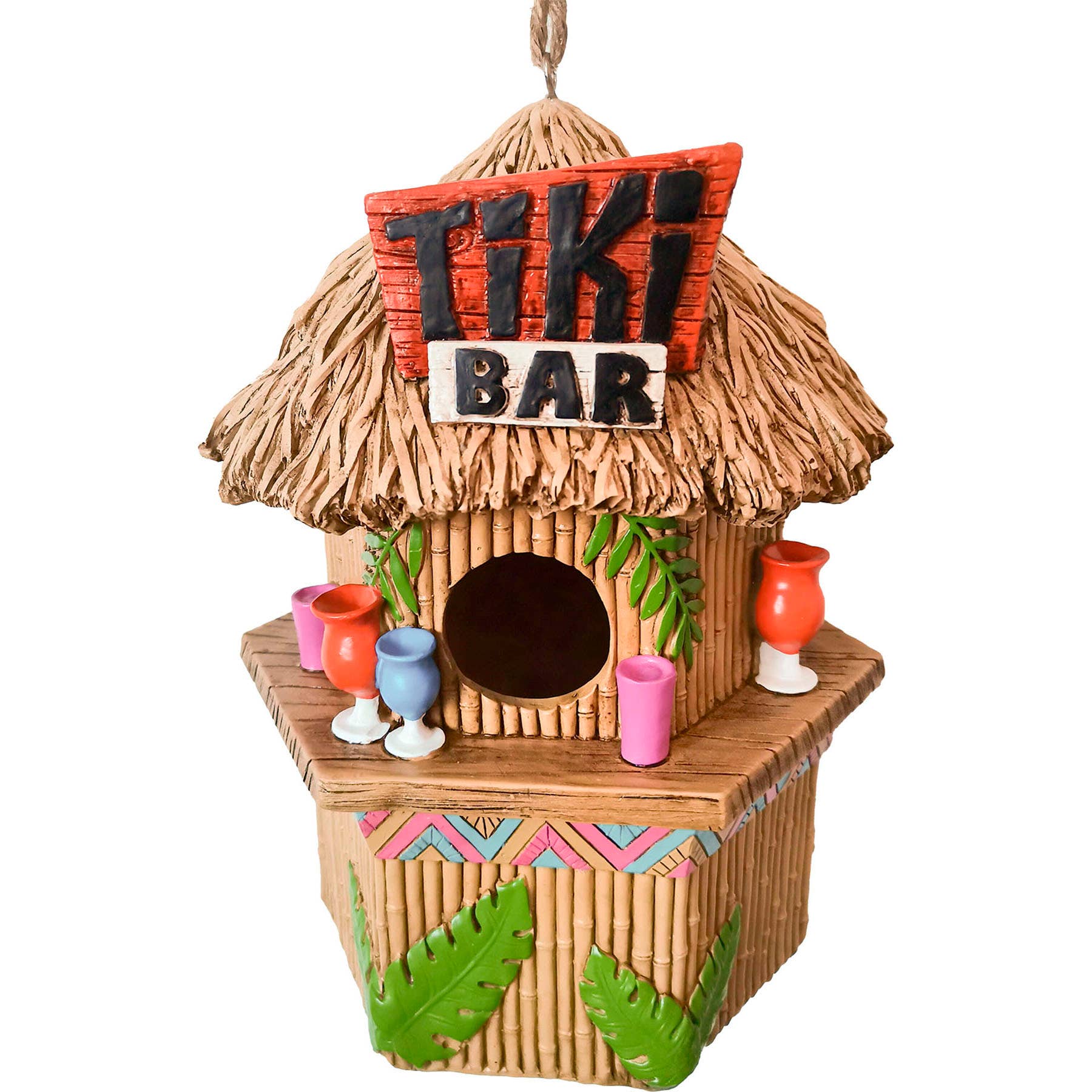 This decorative birdhouse is a lovely way to brighten up your indoor or outdoor space! It is made of durable hand painted resin and measures 10" high.